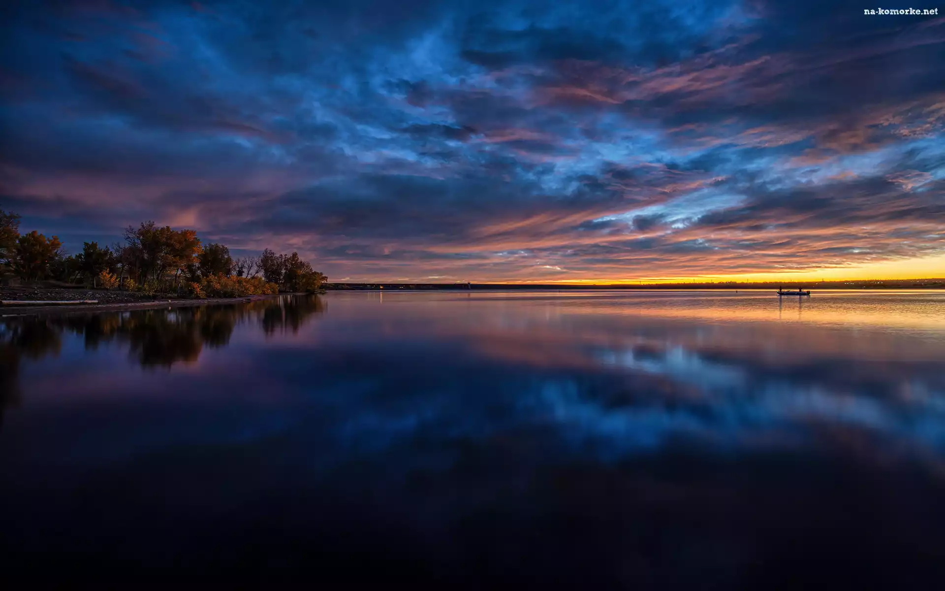 Wschód słońca, Chmury, Jezioro, Stany Zjednoczone, Chatfield Lake, Drzewa, Chatfield State Park, Stan Kolorado na Komórkę |