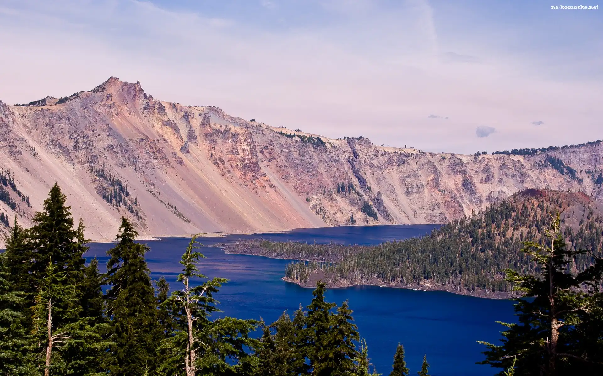 Jezioro Kraterowe, Stan Oregon, Stany Zjednoczone, Wyspa Czarodzieja, Góry, Drzewa na Komórkę