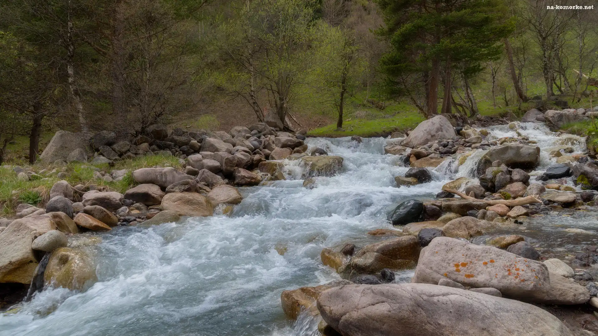 Drzewa, Las, Rzeka, Strumień, Kamienie na Komórkę