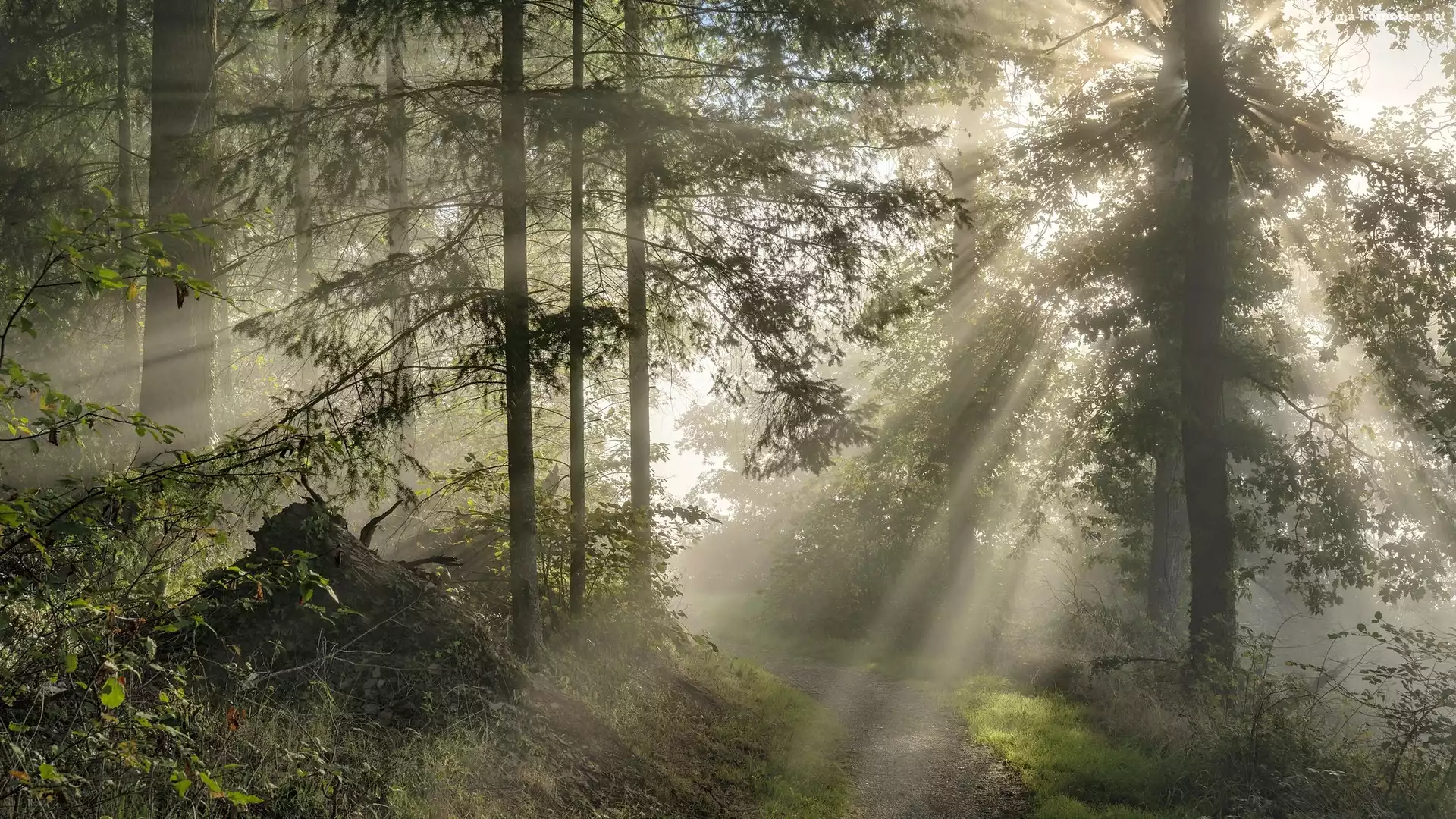 Las, Droga, Mgła, Drzewa, Przebijające światło na Komórkę