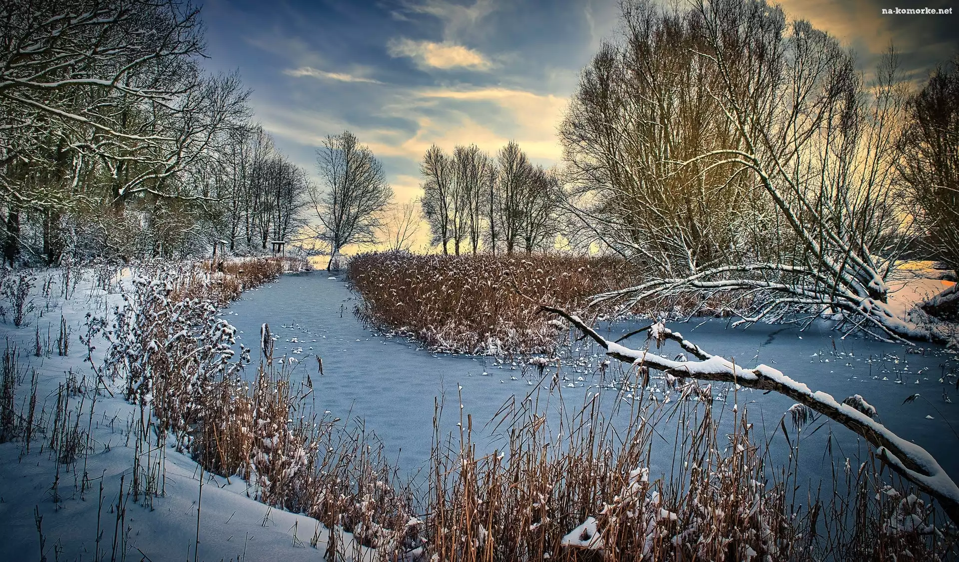 Zima, Drzewa, Szuwary, Rzeka, Trawa na Komórkę