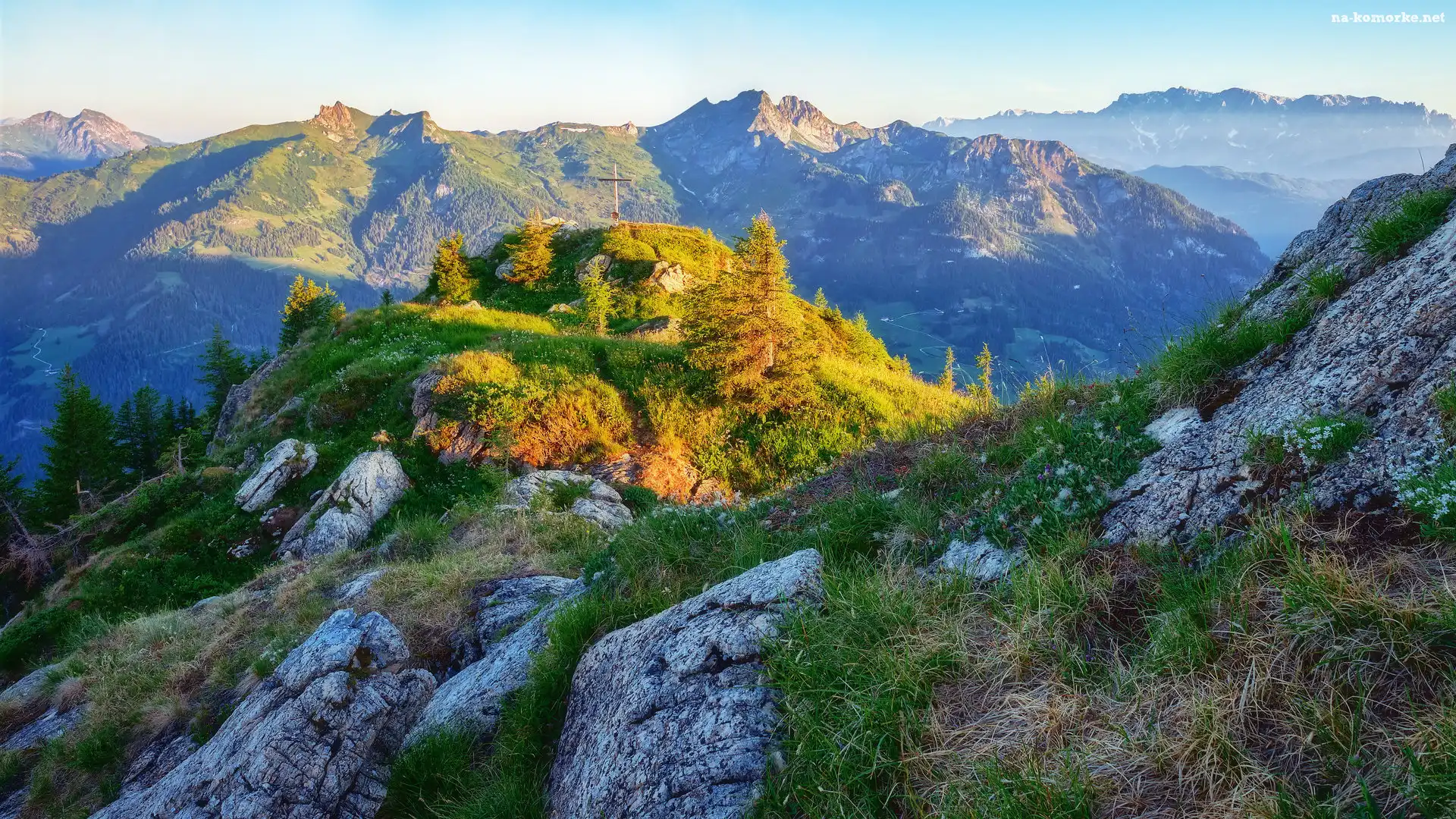 Góra Saukarkopf, Trawa, Niskie Taury, Austria, Góry, Skały, Krzyż, Drzewa na Komórkę