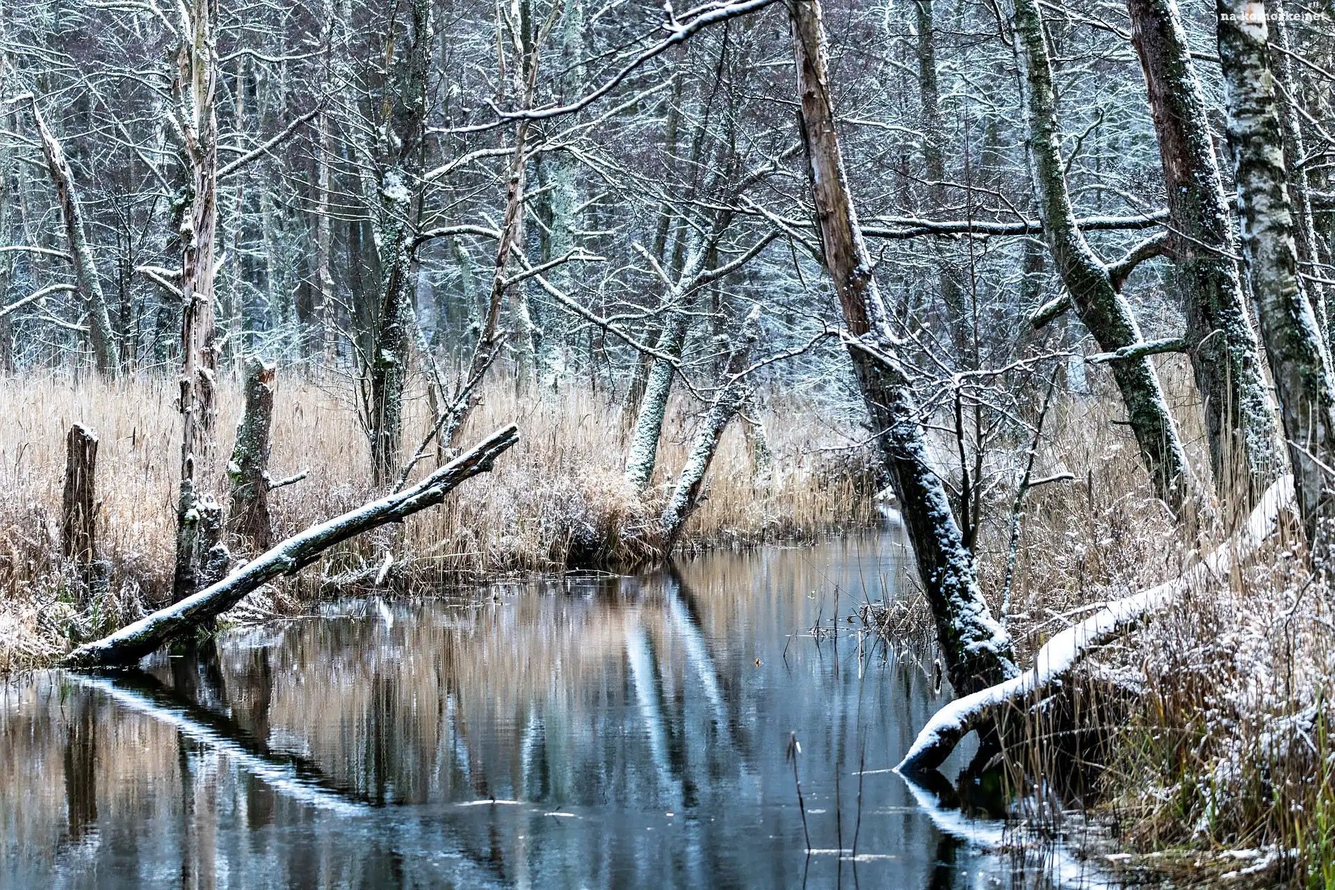 Zima, Drzewa, Trawa, Las, Rzeka na Komórkę