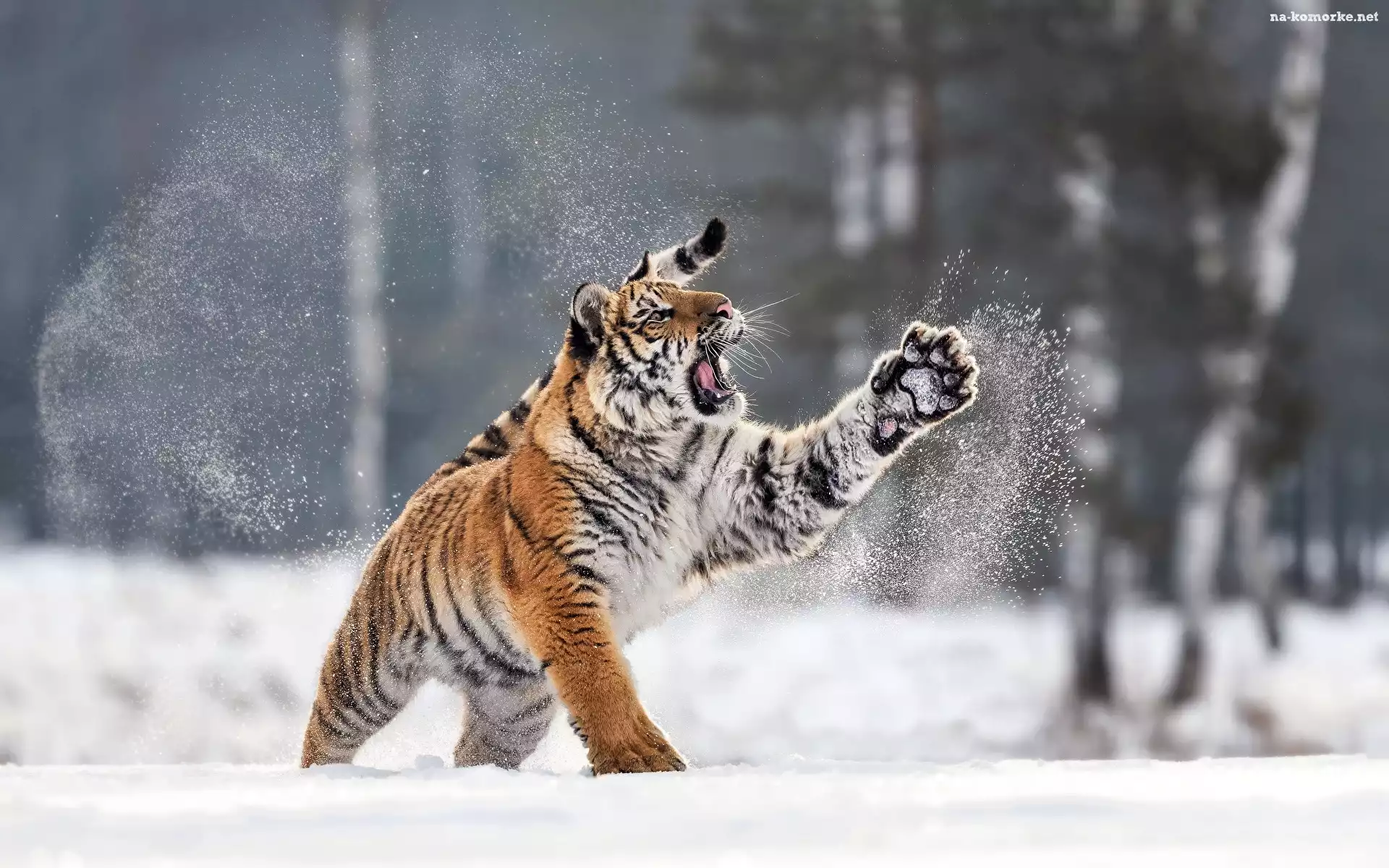 Drzewa, Podniesiona, Otwarta, Zima, Paszcza, Łapa, Tygrys syberyjski, Śnieg na Komórkę