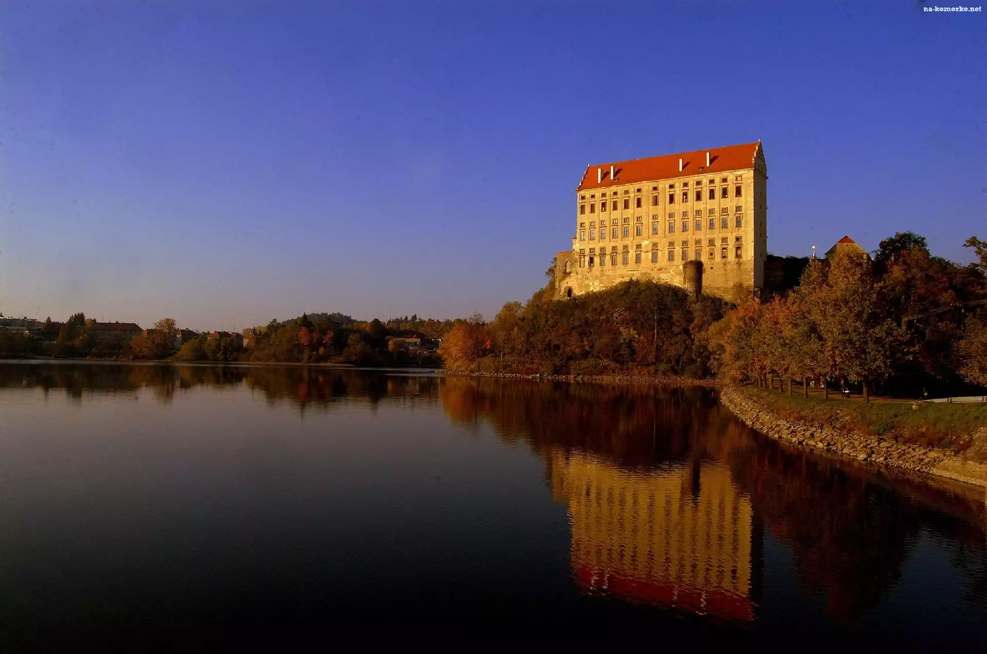 Drzewa, Zamek, Plumlov, Woda, Odbicie na Komórkę