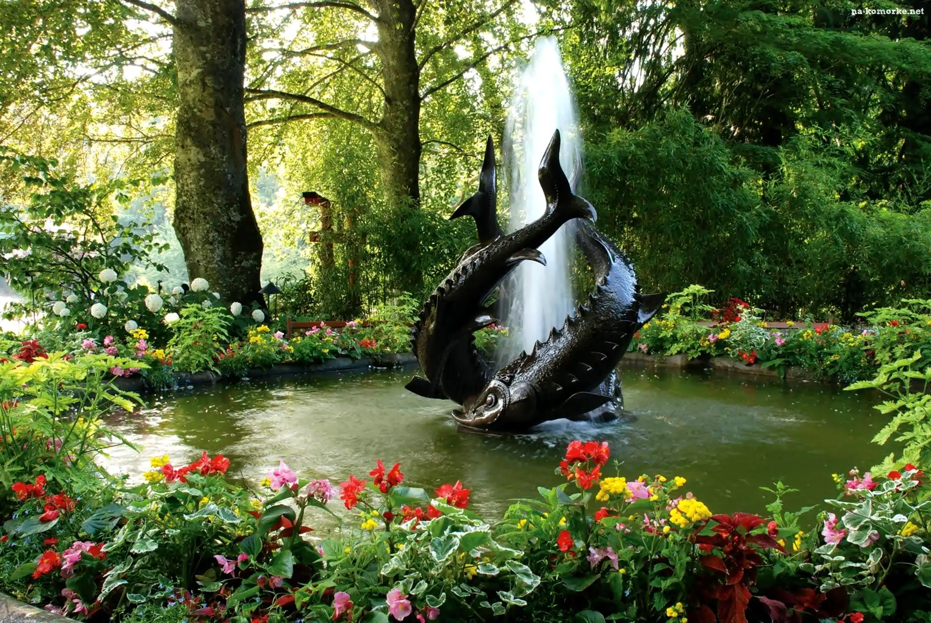 Drzewa, Fontanna, Rekiny, Woda, Kwiaty na Komórkę