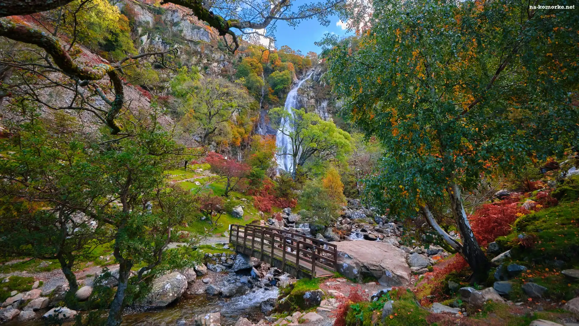 Drzewa, Mostek, Rzeka, Góry, Wodospad, Kamienie na Komórkę