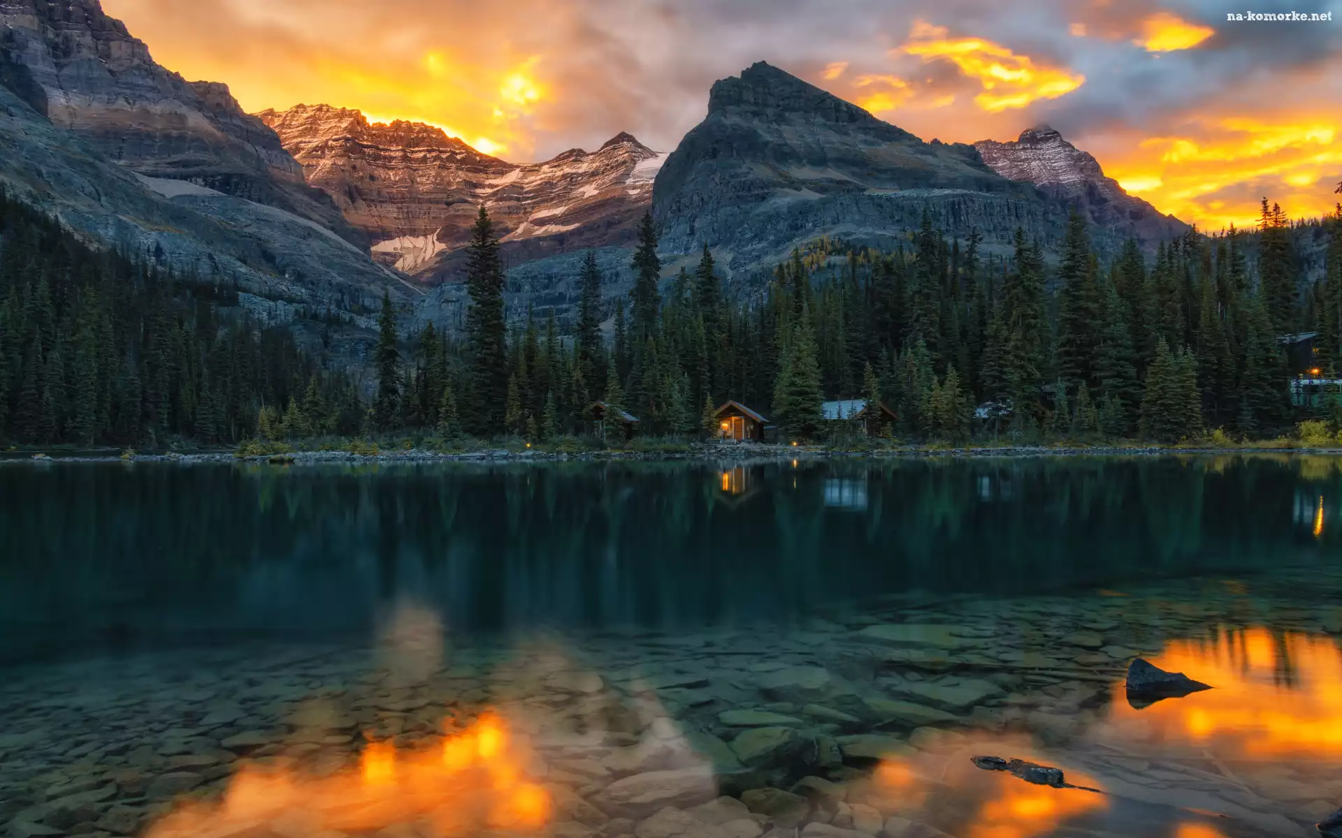 Chmury, Domy, Góry, Lake OHara, Niebo, Drzewa, Park Narodowy Yoho, Las, Zachód Słońca, Alberta, Jezioro, Kanada, Odbicie, Canadian Rocky Mountains na Komórkę |
