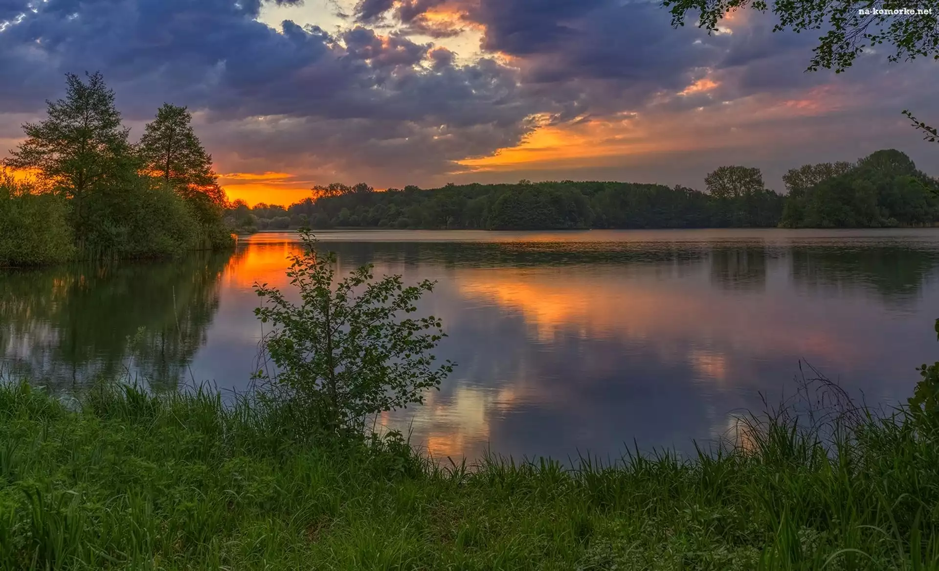 Drzewa, Rzeka, Chmury, Odbicie, Zachód Słońca na Komórkę