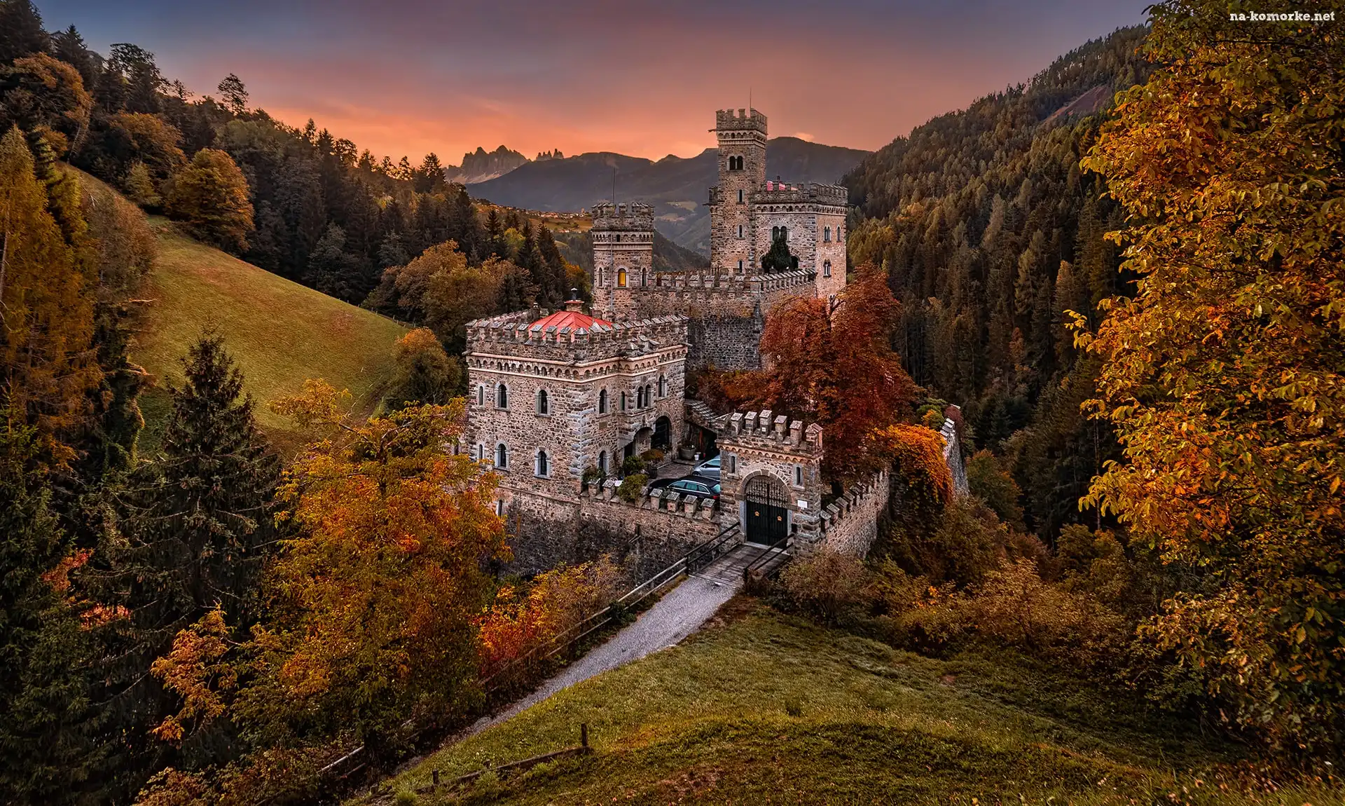 Drzewa, Jesień, Włochy, Zachód słońca, Dolomity, Zamek Gernstein, Góry na Komórkę