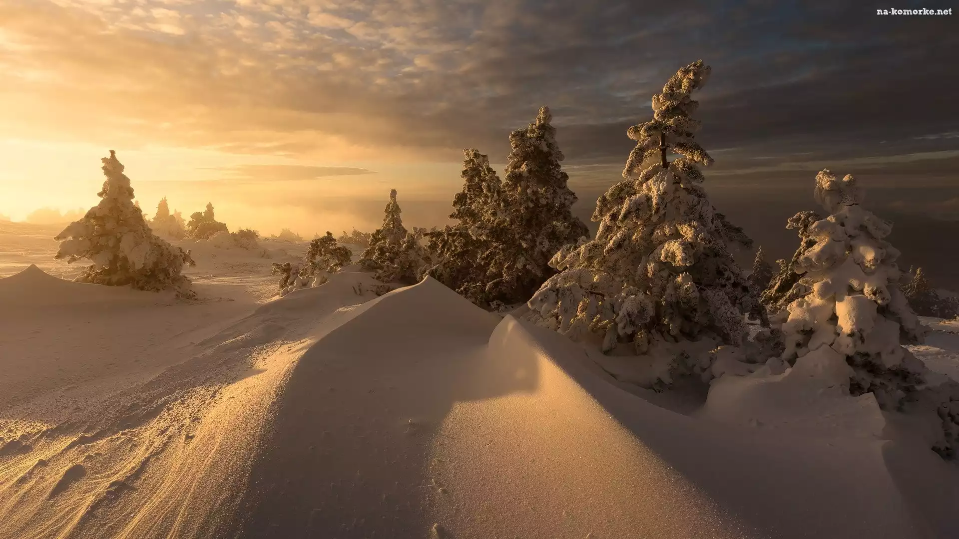 Wschód słońca, Ośnieżone, Drzewa, Zima, Zaspy na Komórkę