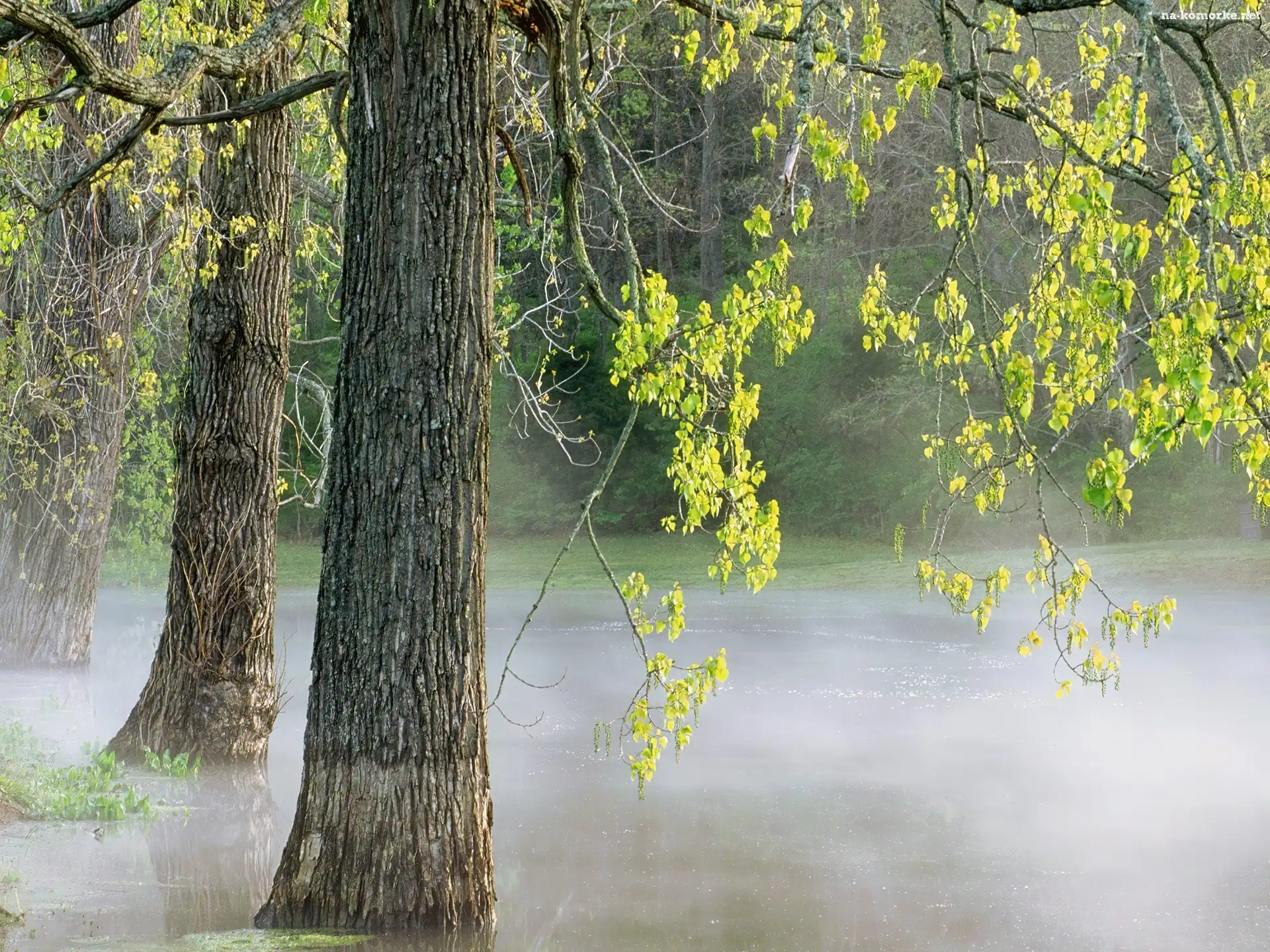 Drzewa, Mgła, Zielone, Listki na Komórkę