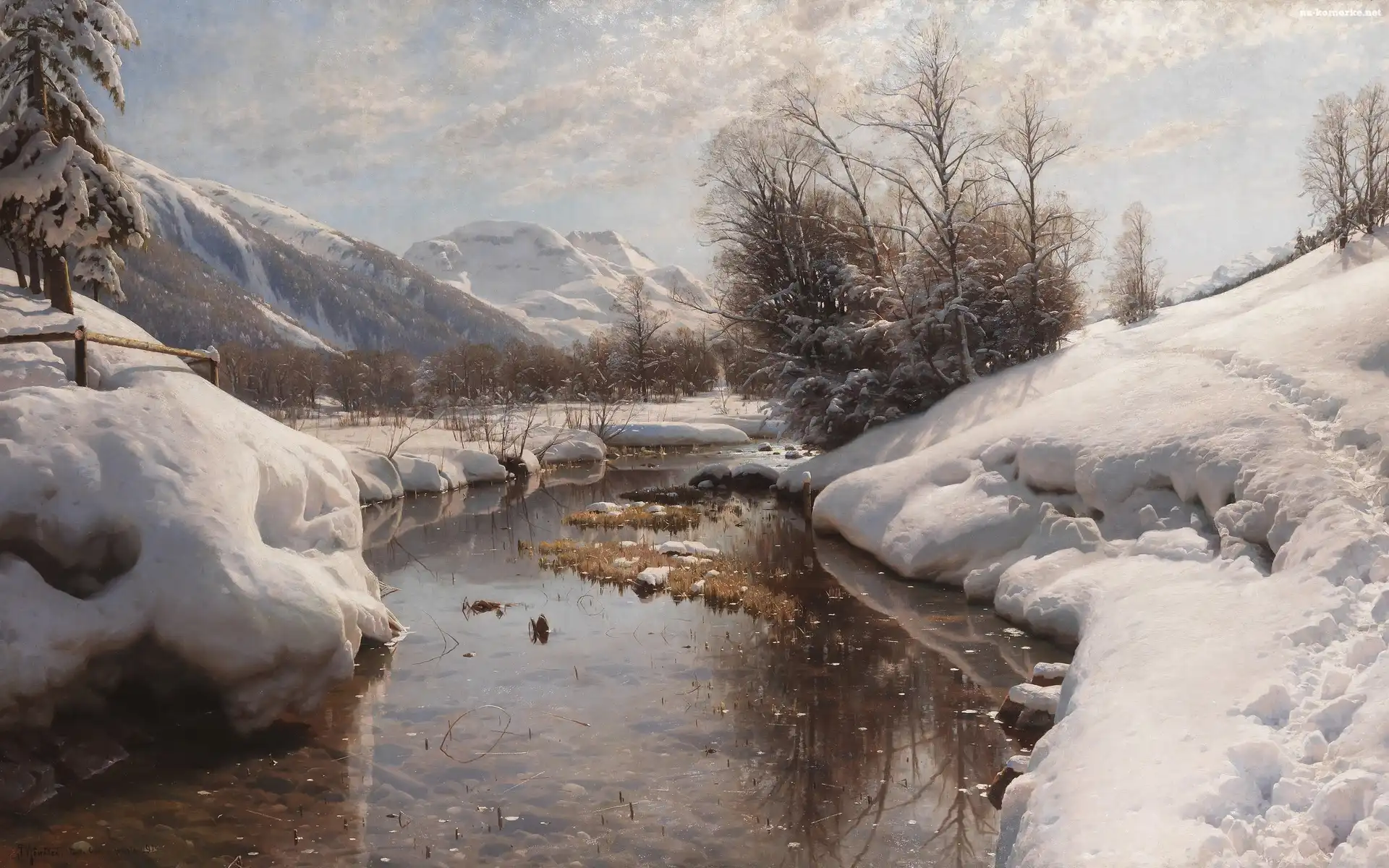 Malarstwo, Góry, Zima, Obraz, Peder Mork Monsted, Rzeka, Drzewa na Komórkę