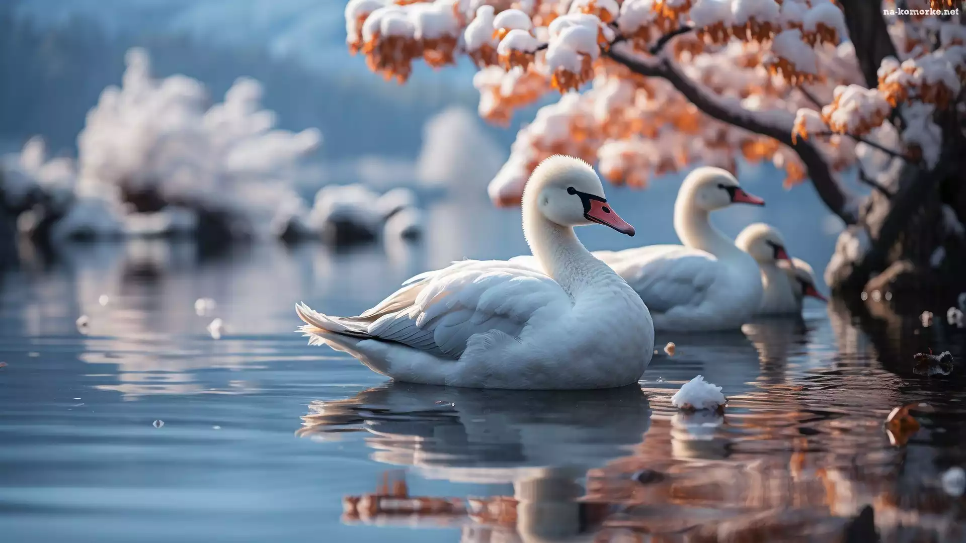 Ośnieżone, Grafika, Łabędzie, Drzewa, Jezioro, Zima na Komórkę
