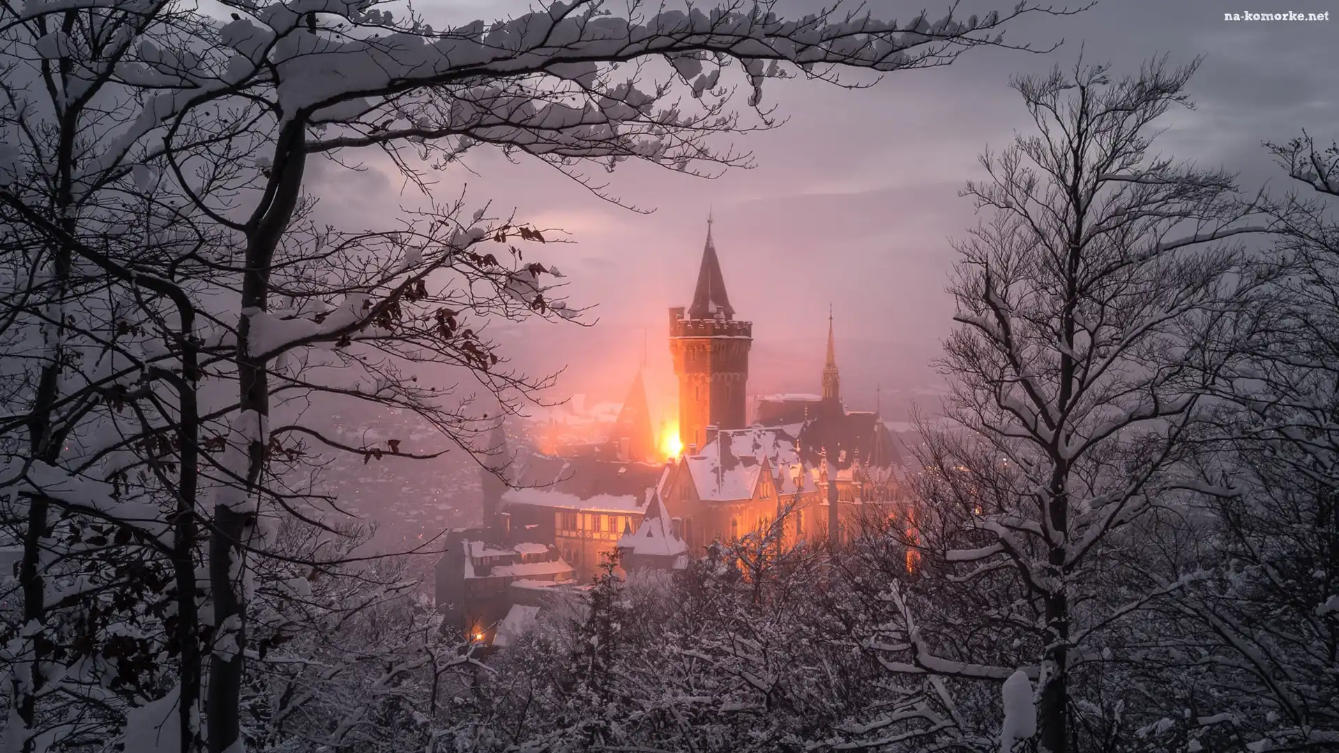 Niemcy, Drzewa, Światła, Saksonia, Wernigerode, Zamek Wernigerode, Zima na Komórkę