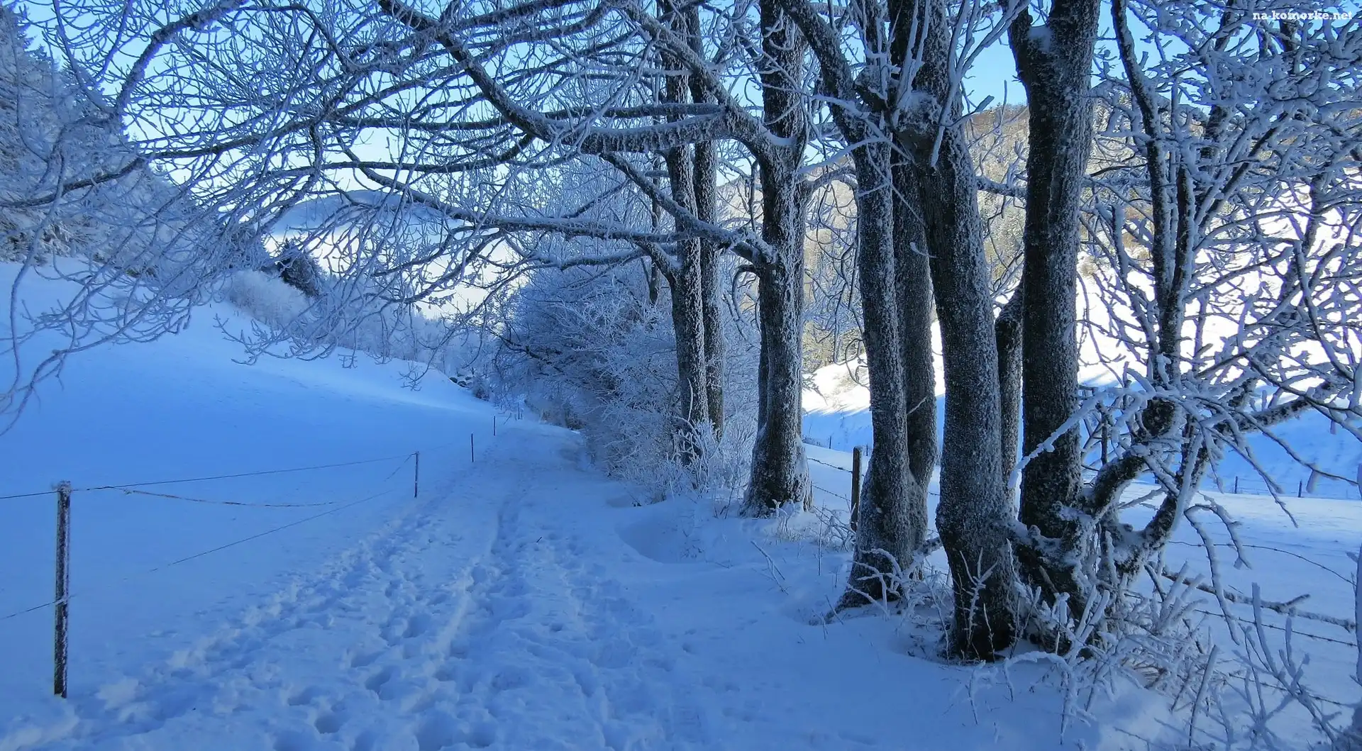 Ślady, Zima, Oszronione, Drzewa, Droga na Komórkę