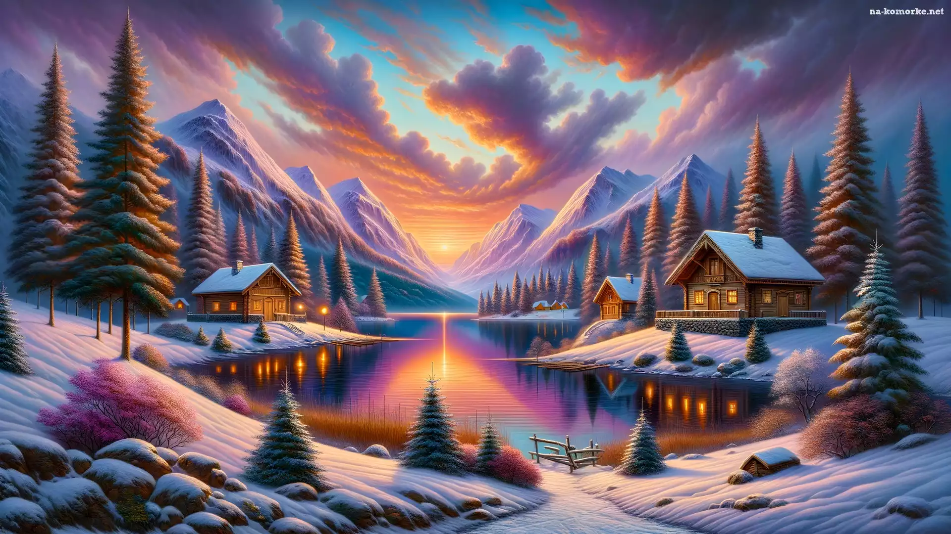 Zachód słońca, Zima, Drzewa, Grafika, Jeziora, Domy na Komórkę