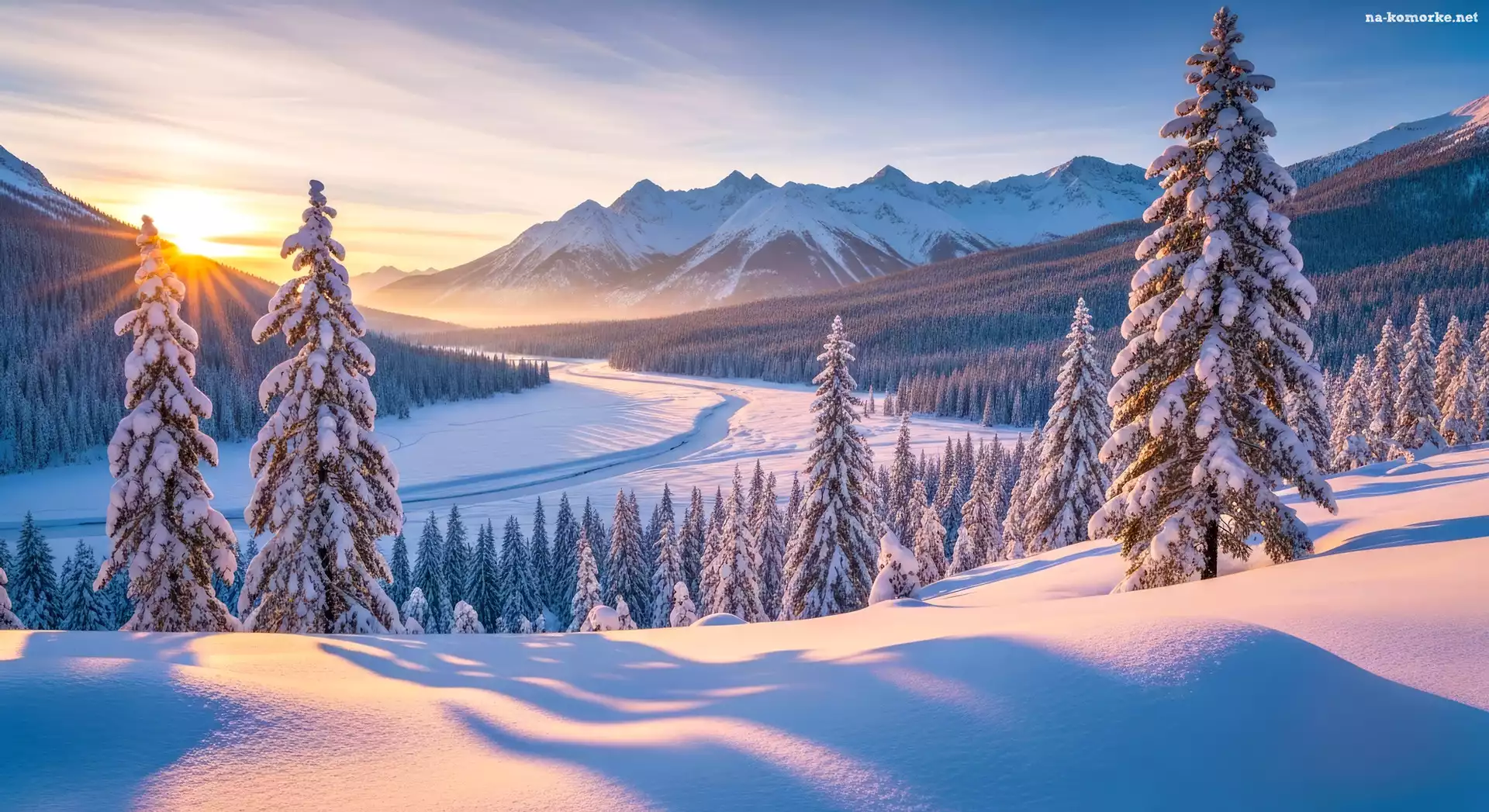 Wschód słońca, Zima, Góry, Grafika AI, Dolina, Drzewa na Komórkę
