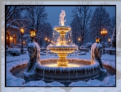 Latarnie, Śnieg, Zima, Drzewa, Figury, Oświetlone, Fontanna na Komórkę