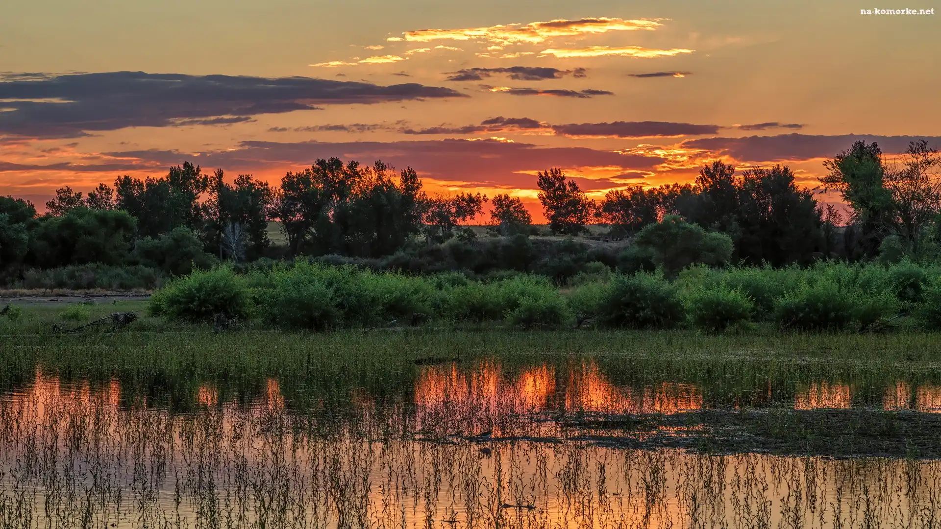Wschód słońca, Kolorado, Stany Zjednoczone, Jezioro, Lake Chatfield, Trawy, Drzewa na Komórkę