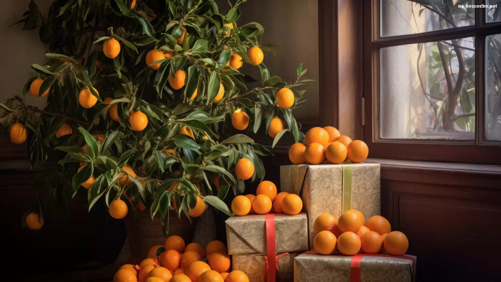 Prezenty, Okno, Pomarańcze, Drzewko na Komórkę