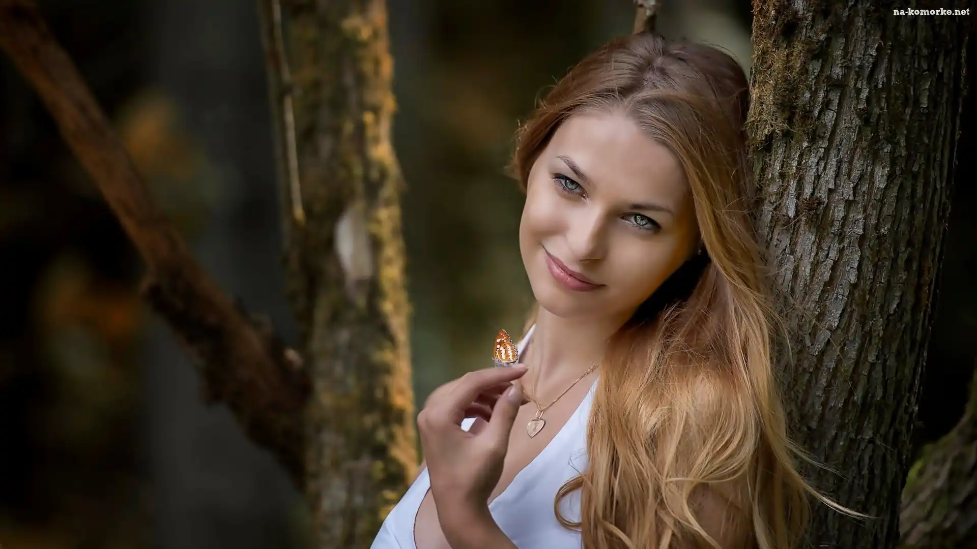 Blondynka, Drzewo, Park, Kobieta, Makijaż, Bizuteria, Motylek na Komórkę