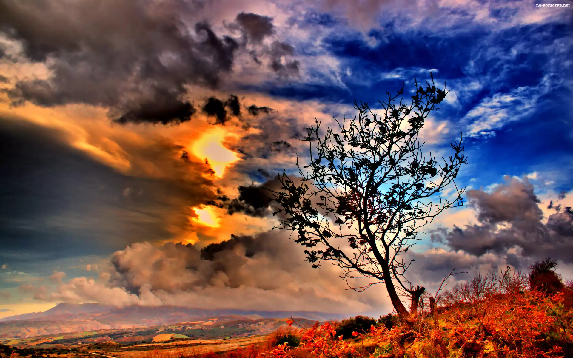Drzewo, Słońca, Chmury, Zachód na Komórkę