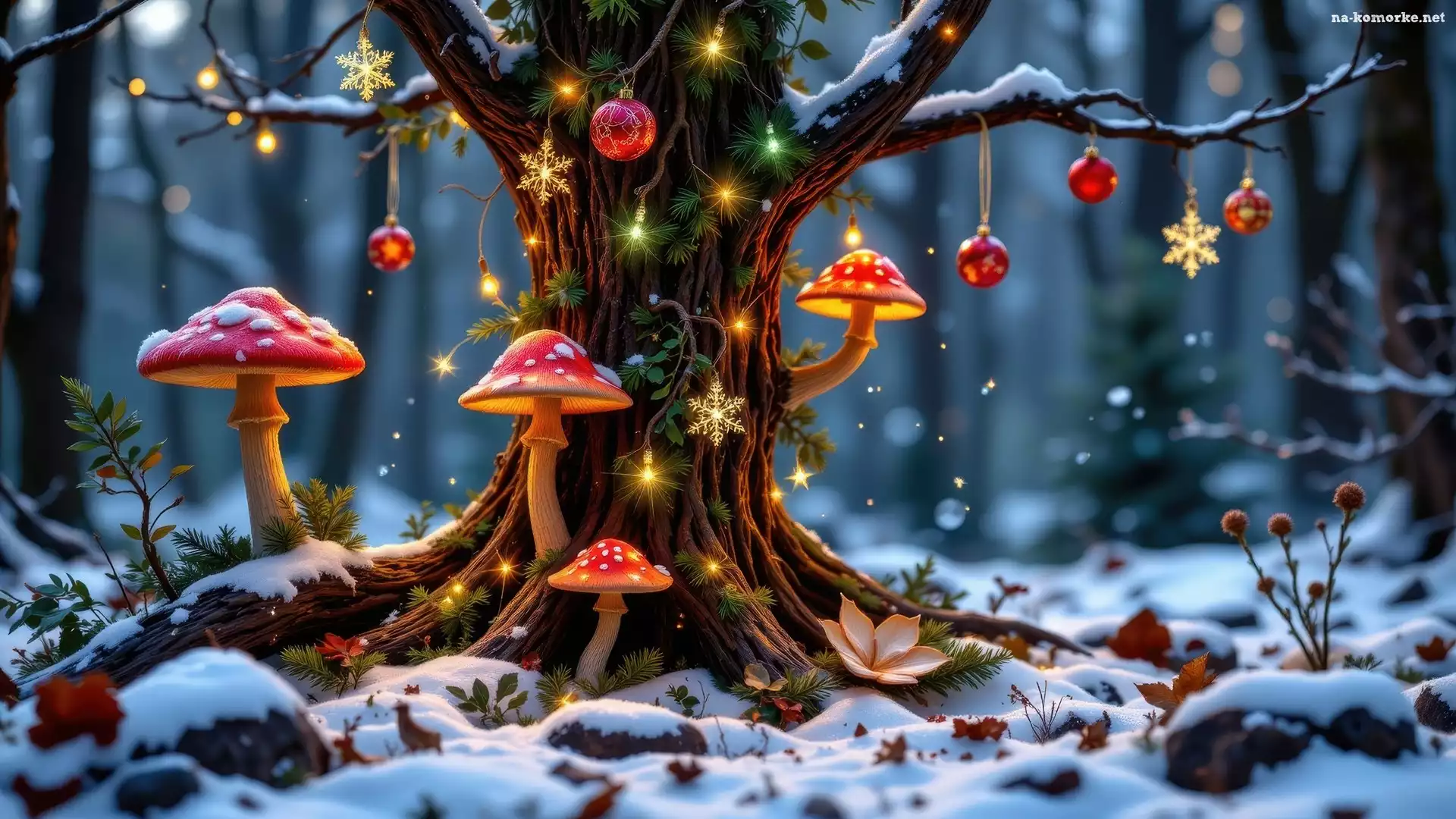 Grzyby, Muchomory, Grafika, Boże Narodzenie, Bombki, Śnieg, Drzewo na Komórkę