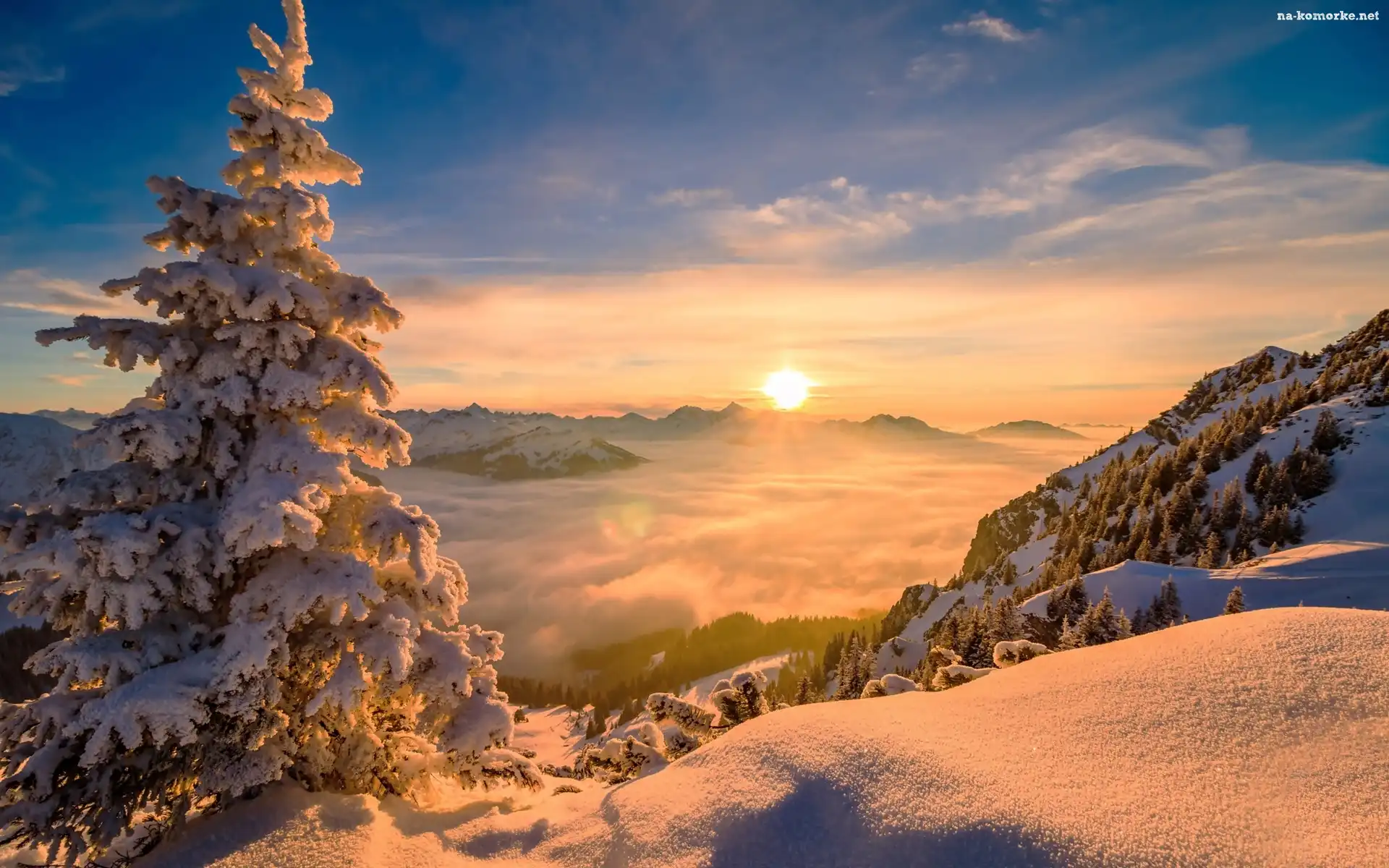 Zima, Drzewo, Świerk, Wschód słońca, Góry, Mgła, Ośnieżone na Komórkę