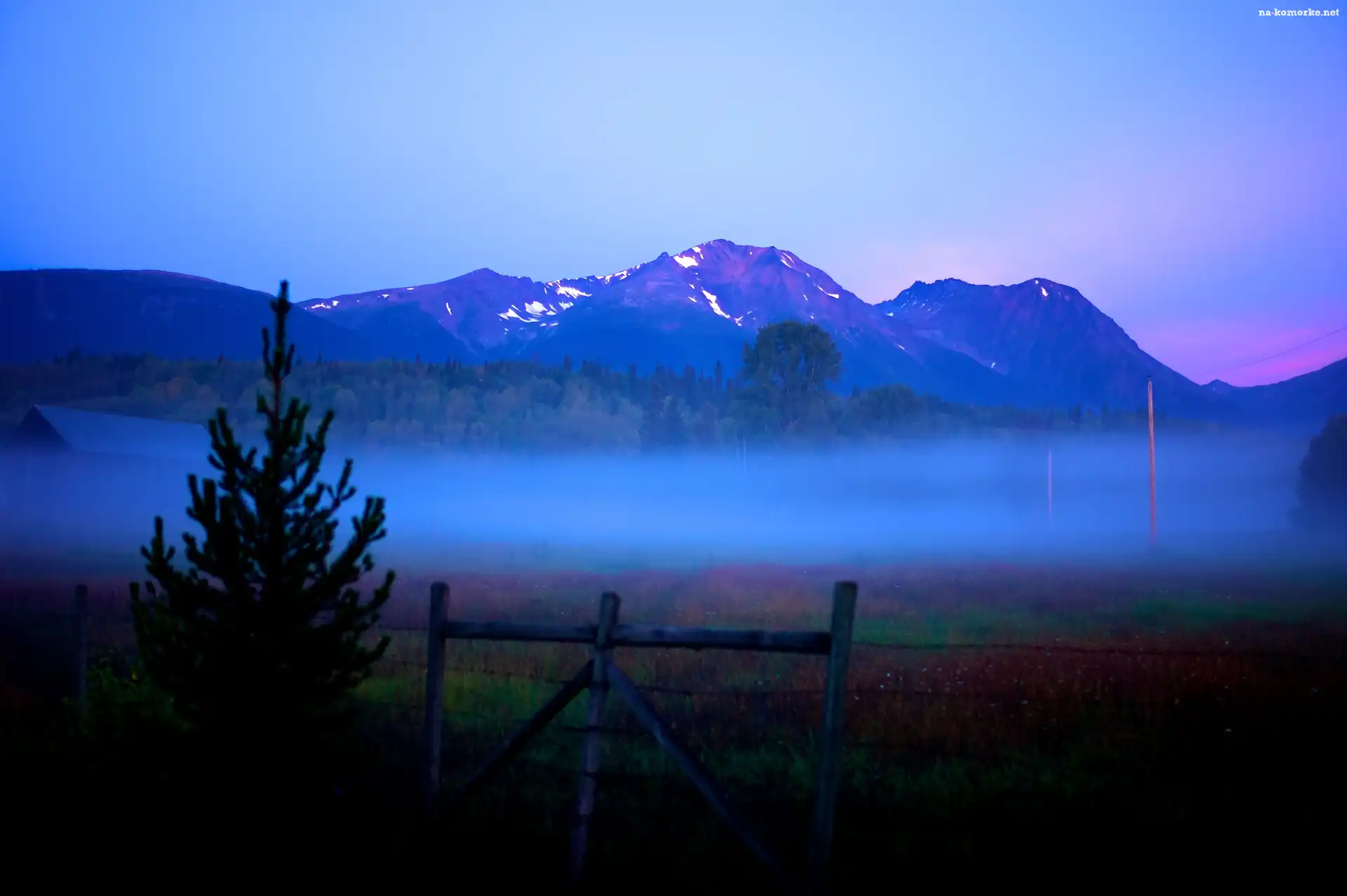 Drzewo, Góry, Płotek, Mgła na Komórkę