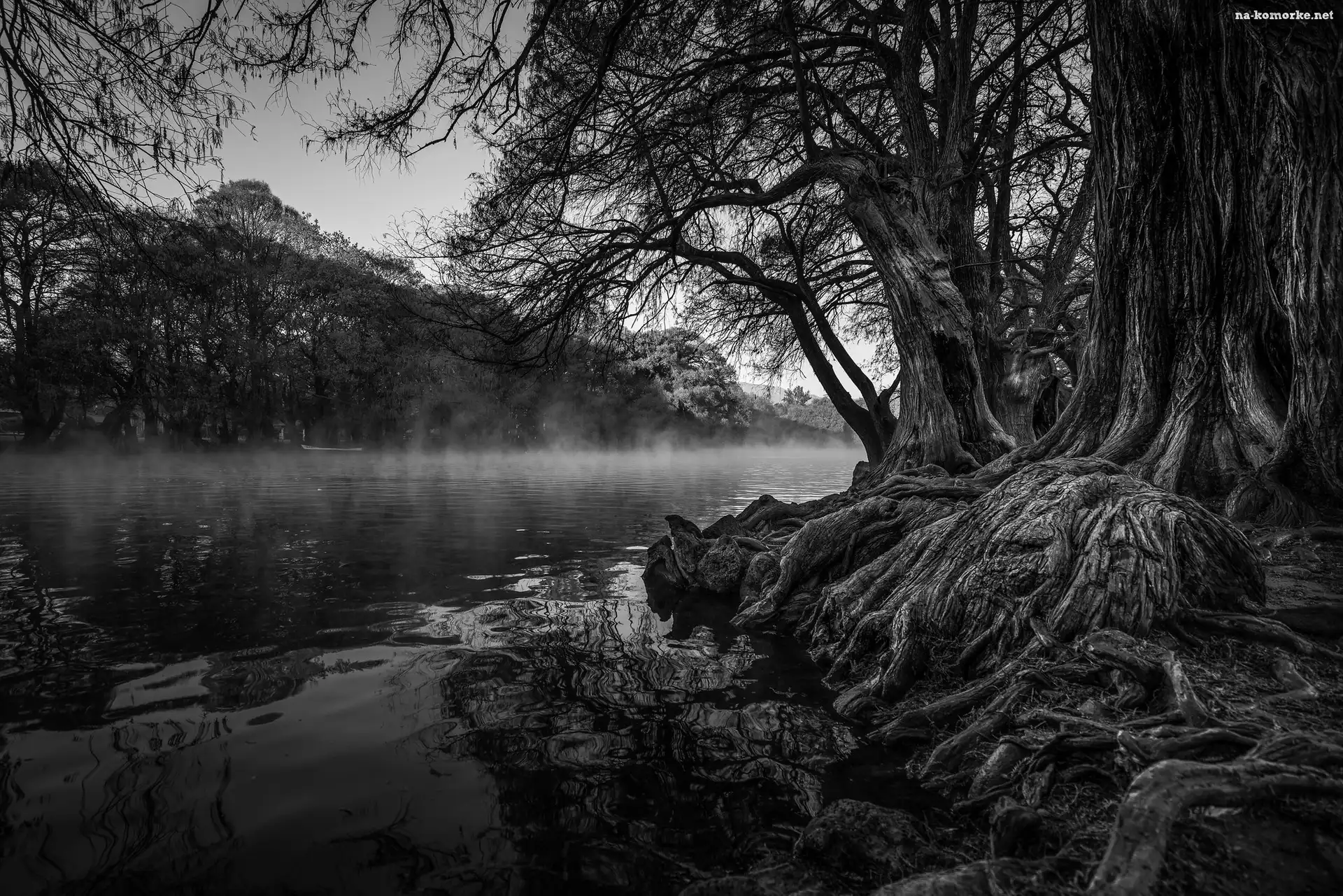 Poranek, Drzewo, Rzeka, Czarno-białe, Korzenie, Mgła na Komórkę