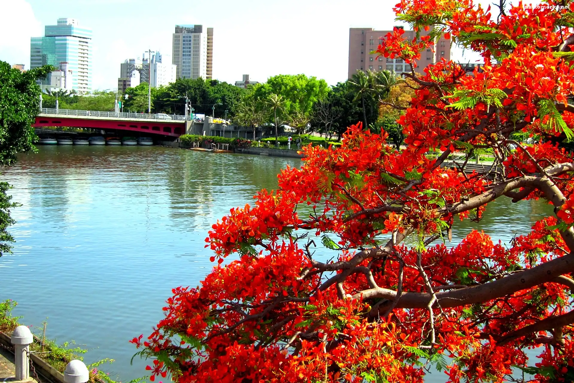 Drzewo, Wieżowce, Rzeka, Most na Komórkę