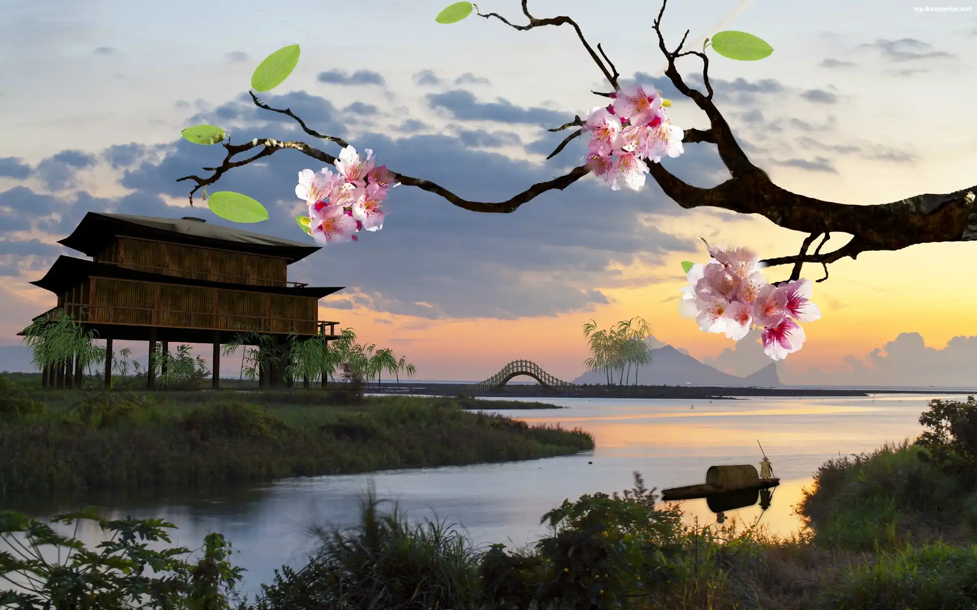 Rzeka, Na, Japonia, Dom, Słońca, Zachód, Most, Palach, Kwitnące, Drzewo na Komórkę