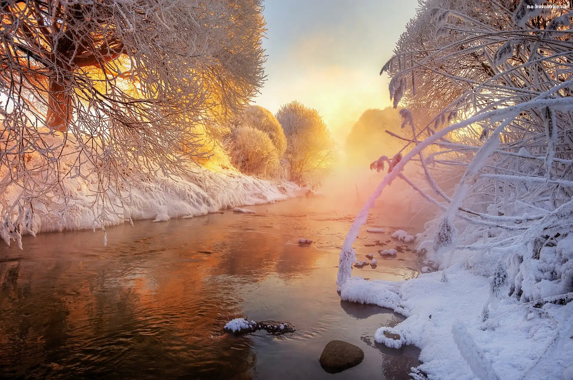 Drzewo, Zima, Rzeka, Wschód słońca, Mgła na Komórkę