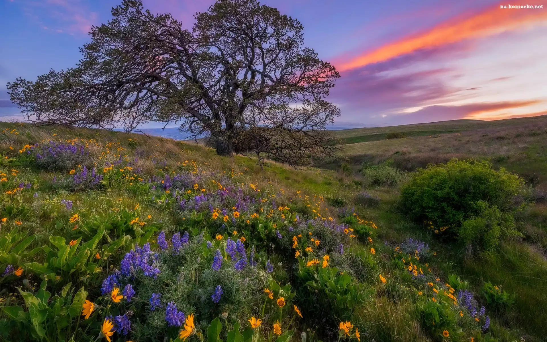 Wzgórze, Zachód słońca, Kwiaty, Chmury, Łąka, Balsamorhiza, Łubin, Drzewo na Komórkę