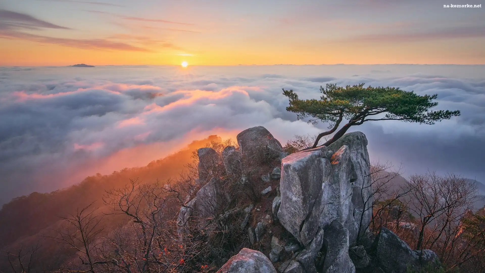 Wschód słońca, Sosna, Mgła, Skały, Góry, Chmury, Rośliny, Drzewo na Komórkę
