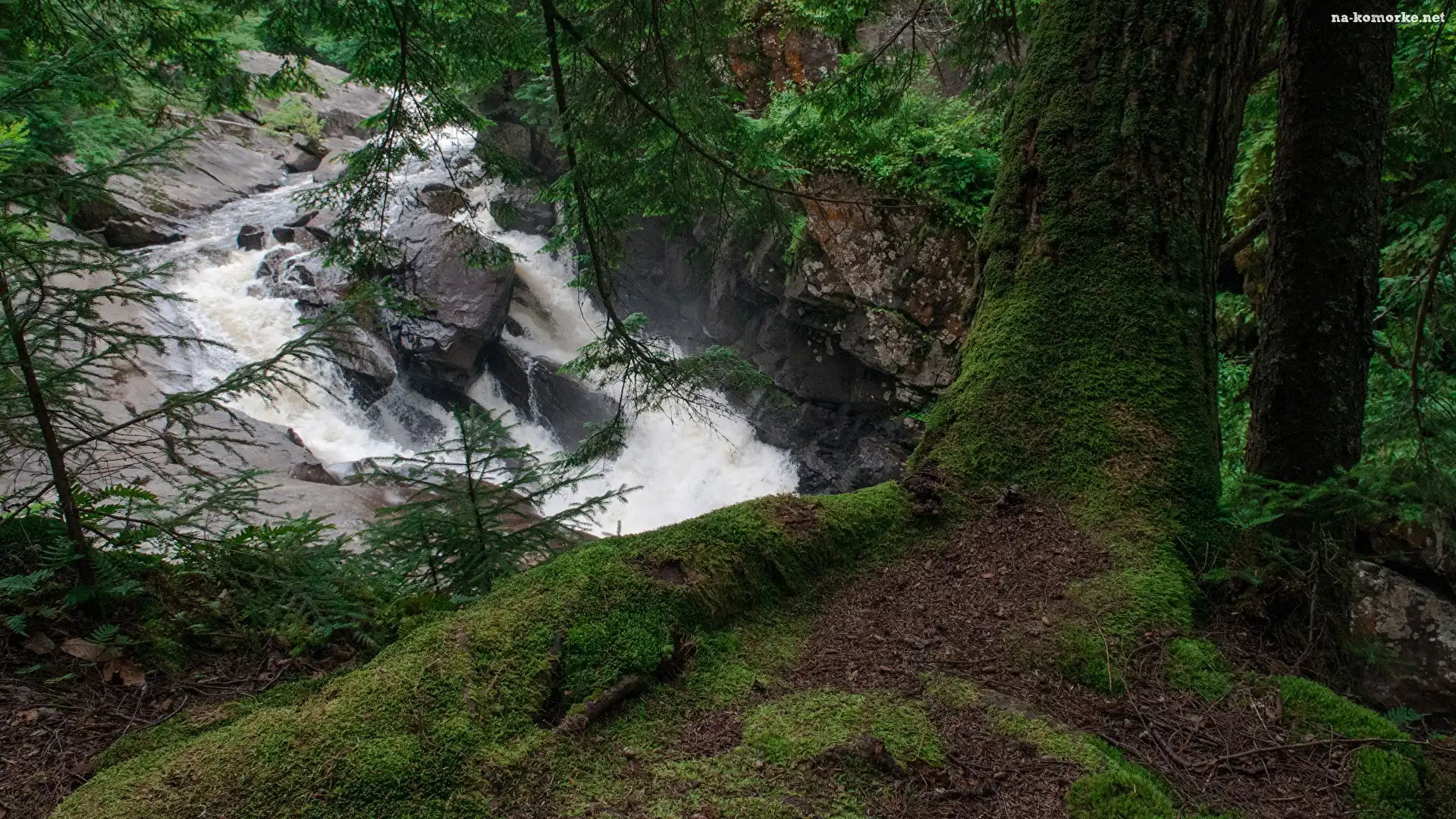 Wodospad, Drzewo, Skały, Pień, Drzewa, Gałęzie, Omszałe na Komórkę