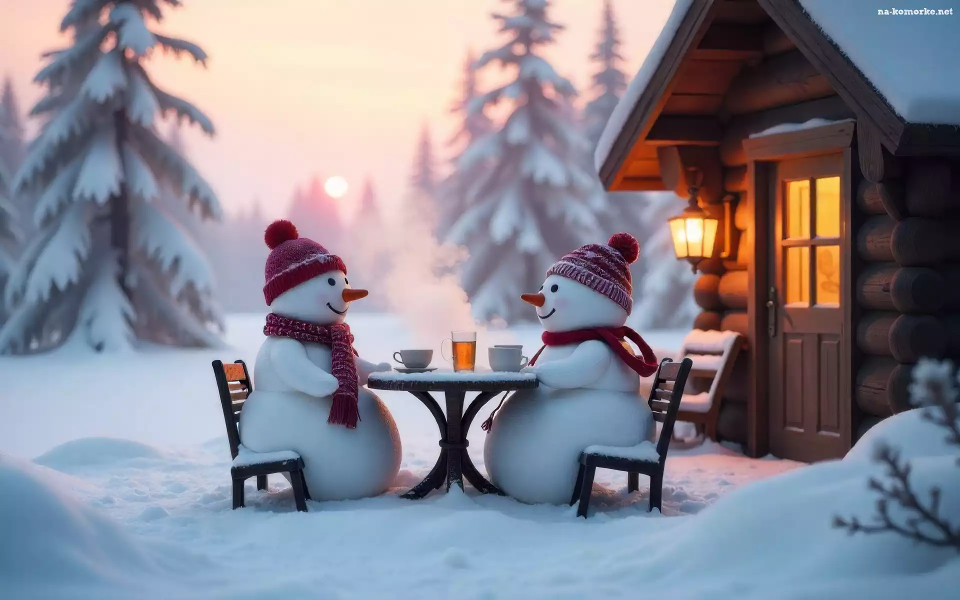Bałwanki, Krzesła, Szaliki, Zima, Stolik, Dom, Czapki, Dwa na Komórkę