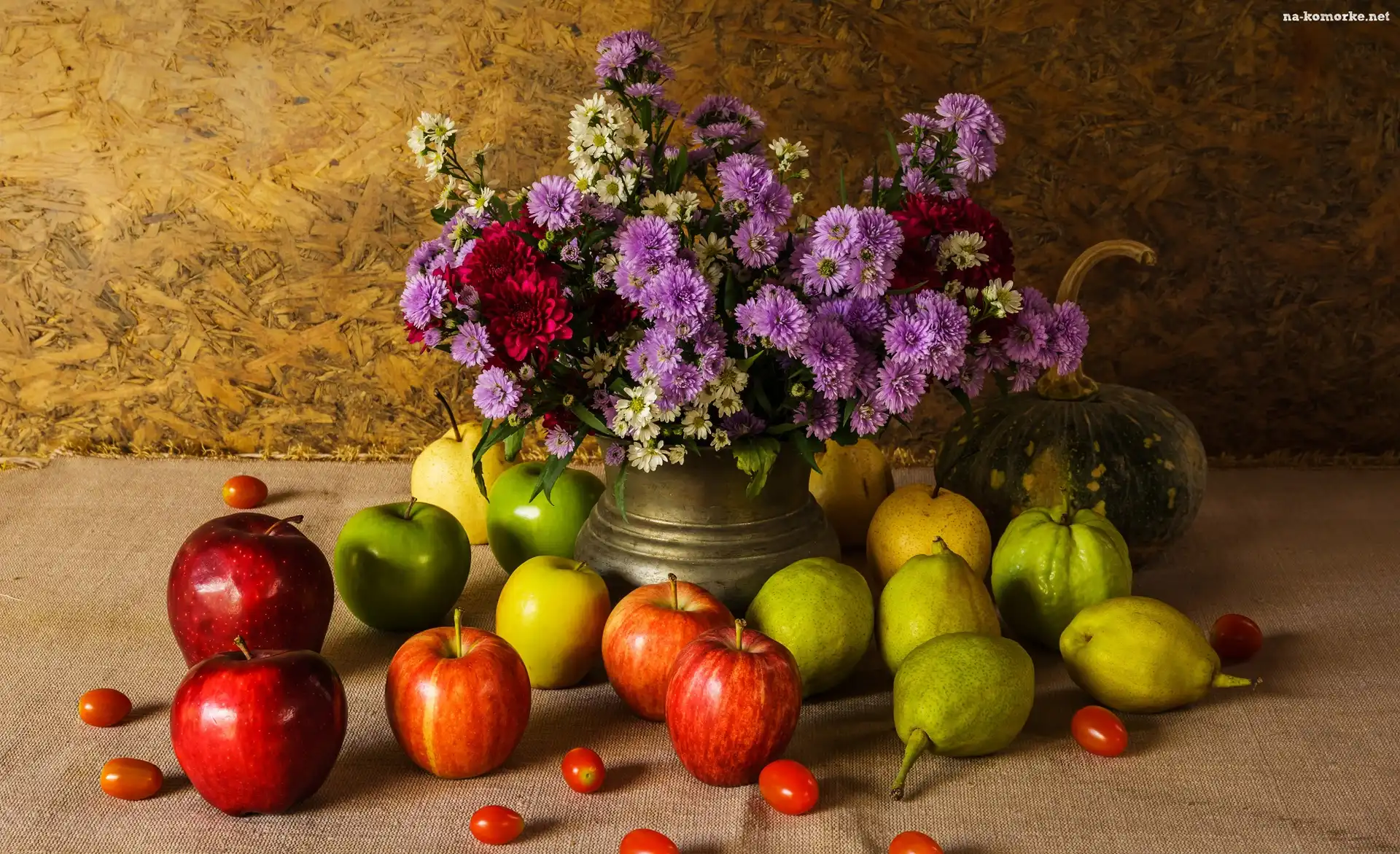 Kompozycja, Kwiaty, Dynia, Bukiet, Warzywa, Gruszki, Wazon, Astry marcinki, Owoce, Jabłka na Komórkę |