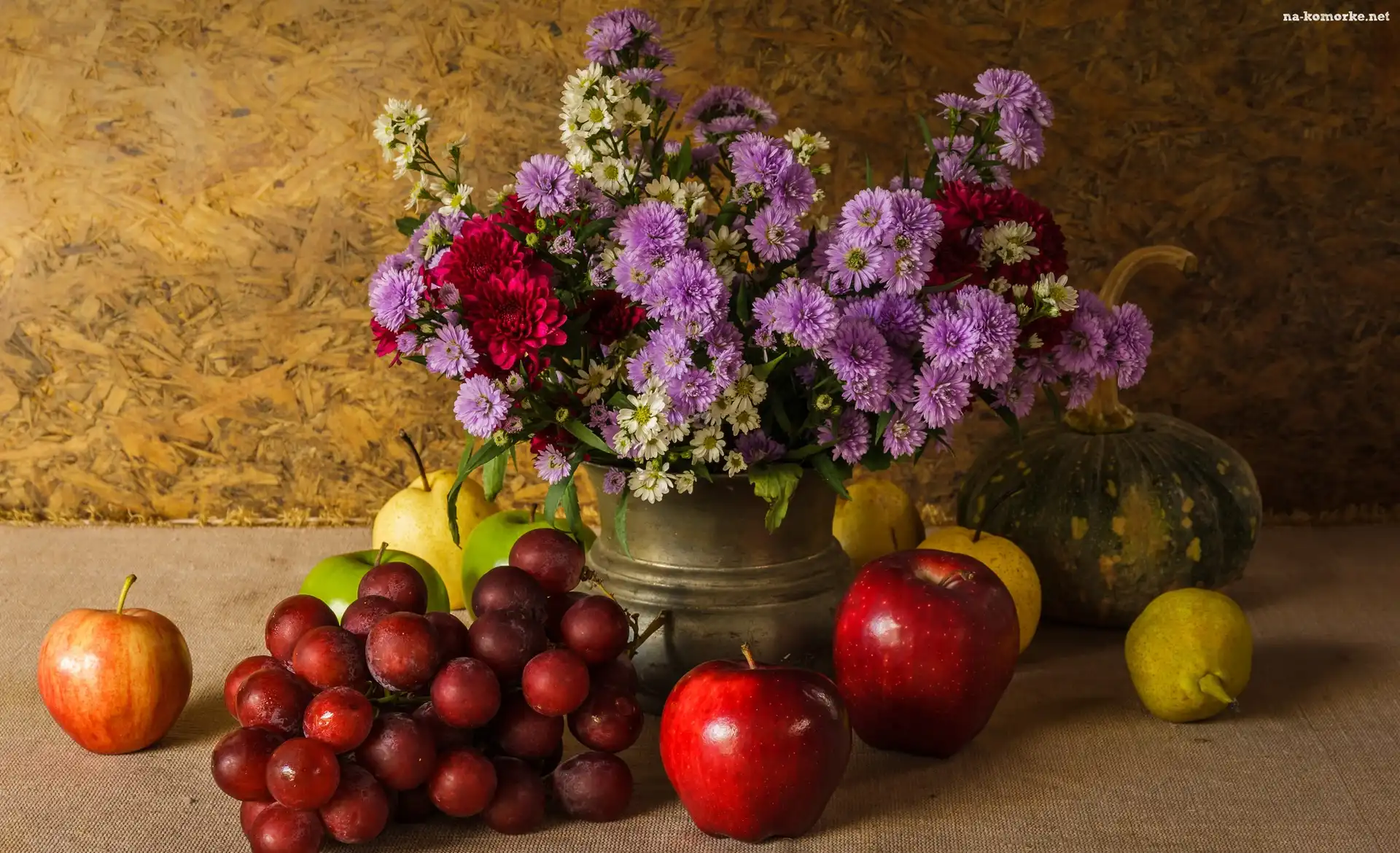 Kompozycja, Kwiaty, Dynia, Bukiet, Winogrona, Gruszki, Wazon, Astry marcinki, Owoce, Jabłka na Komórkę |