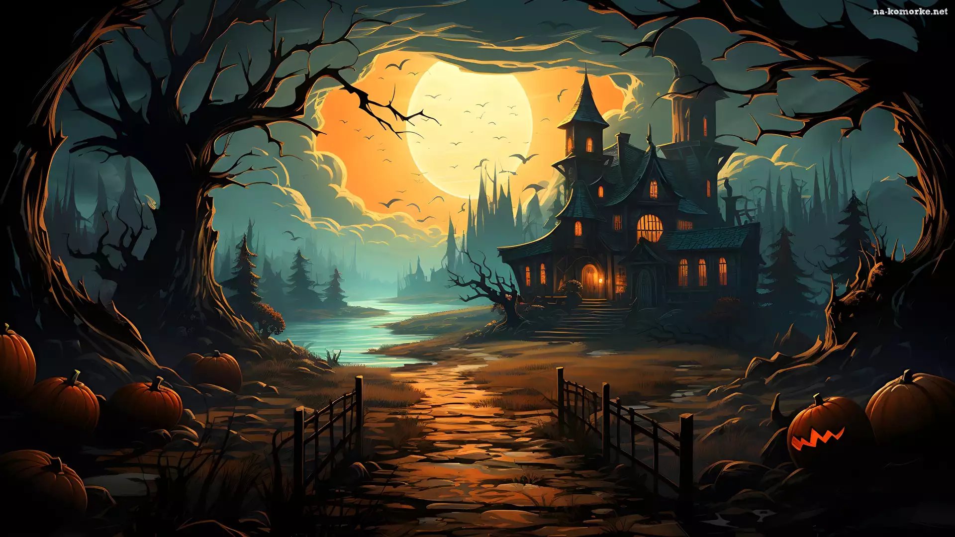 Droga, Drzewa, Halloween, Dynie, Księżyc, Zamek, Noc na Komórkę