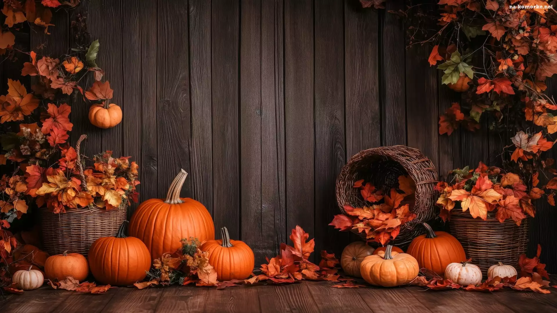Kosze, Deski, Liście, Kompozycja, Jesienne, AI, Wiklinowe, Dynie na Komórkę