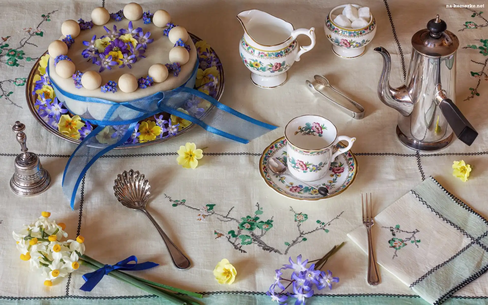 Kompozycja, Dzbanek, Serwetka, Narcyzy, Tort, Filiżanka, Cukier na Komórkę
