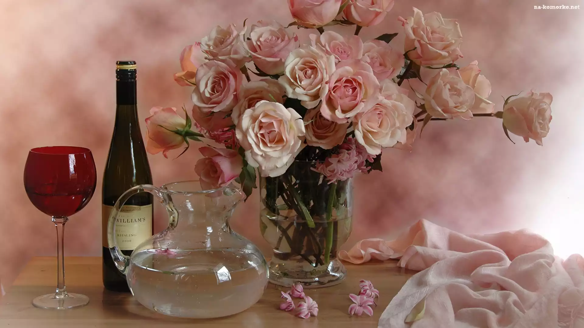 Dzbanek, Róże, Różowe, Wino, Szklany, Kieliszek na Komórkę
