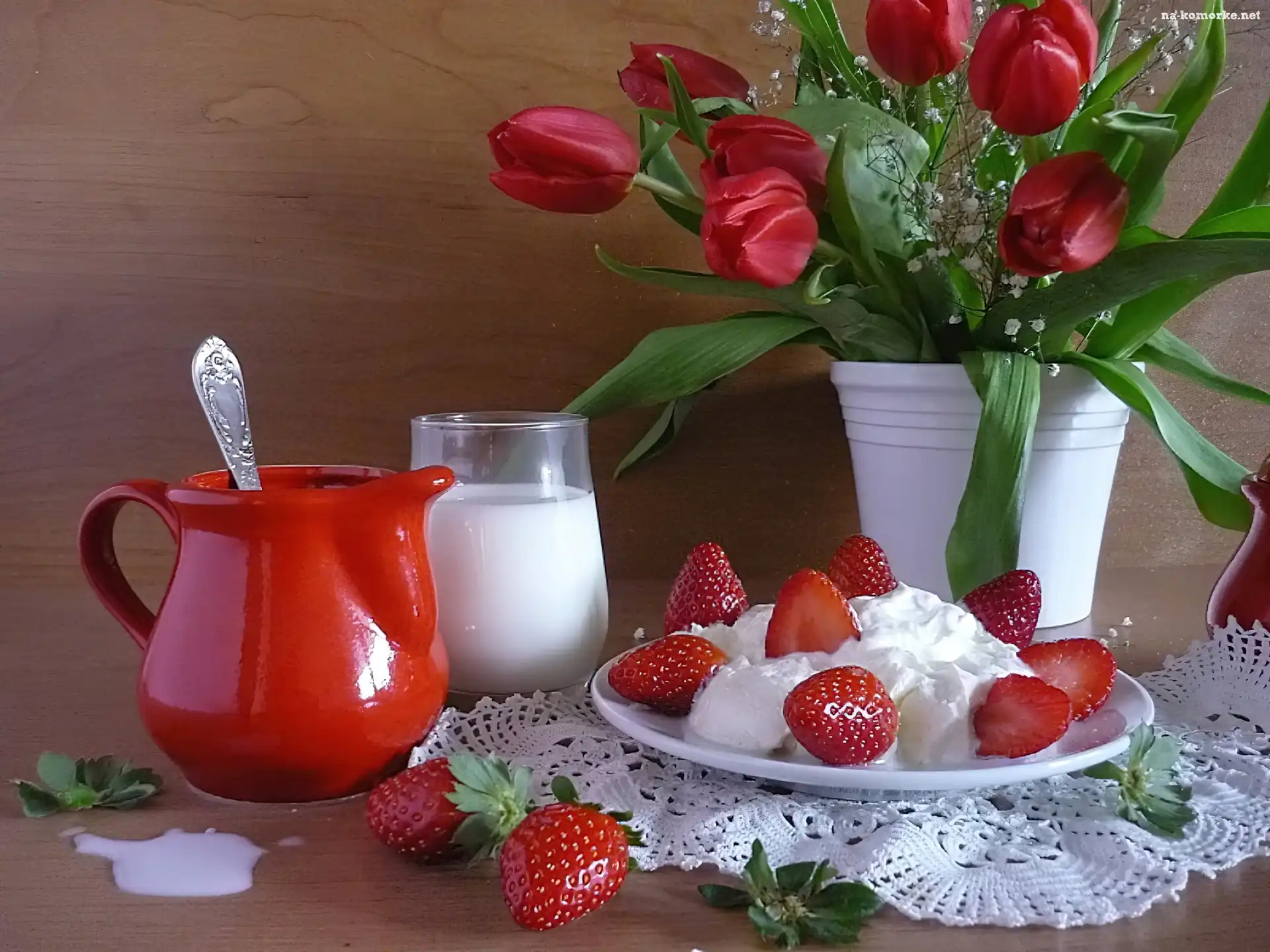 Dzbanek, Kwiaty, Czerwone, Tulipany, Truskawki na Komórkę