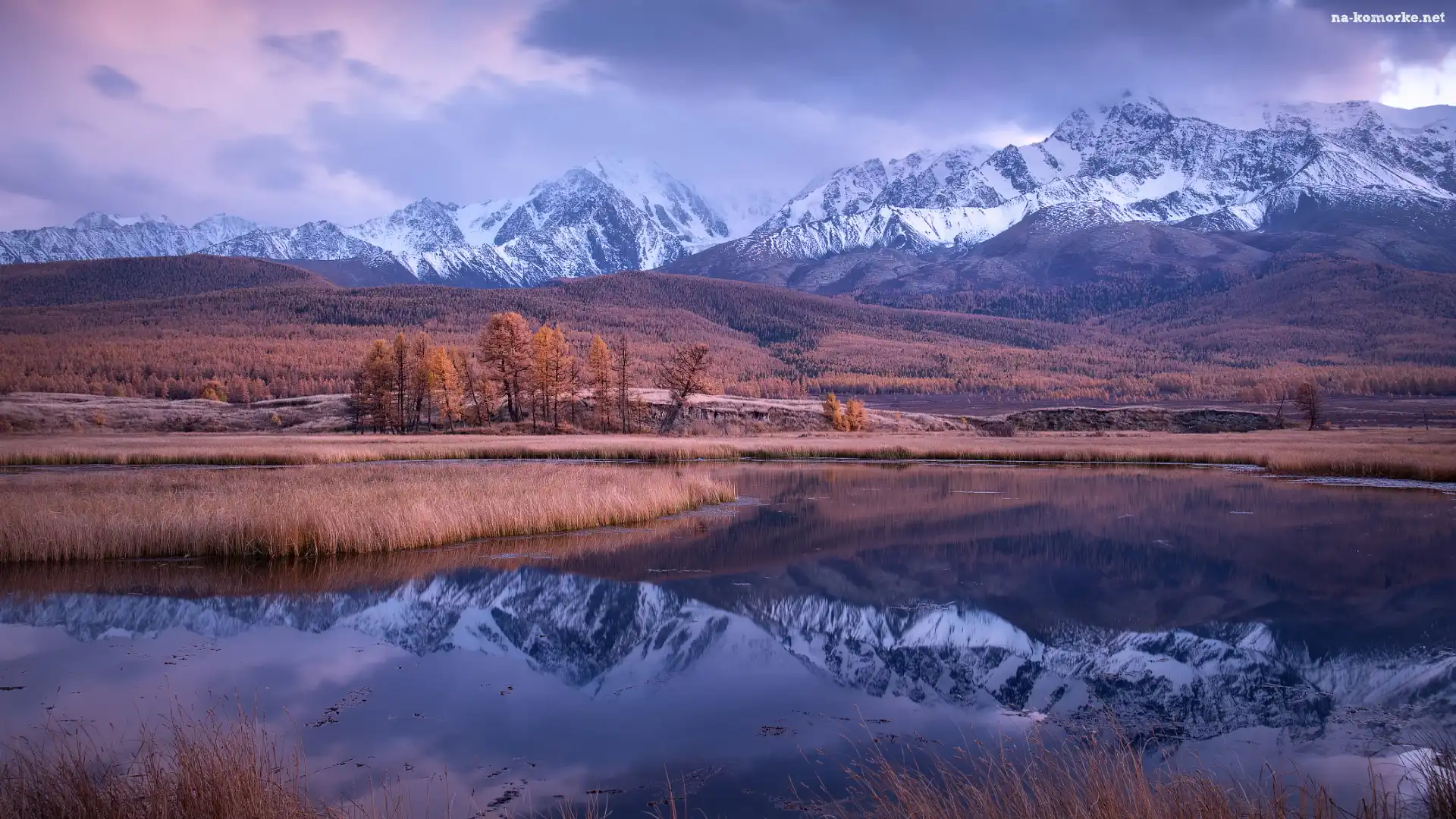 Góry Północnoczujskie, Rosja, Ałtaj, Ośnieżone, Szczyty, Drzewa, Jezioro Dzhangyskol na Komórkę |