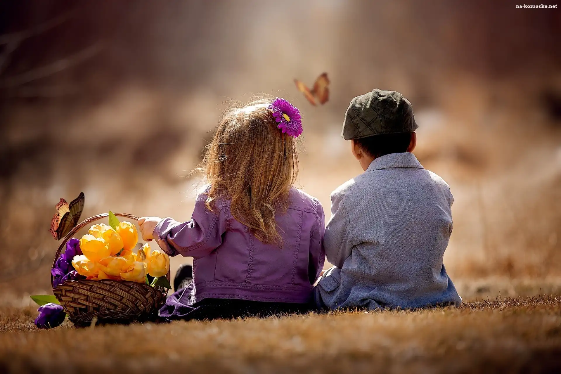 Dzieci, Motyle, Koszyk, Tulipany na Komórkę