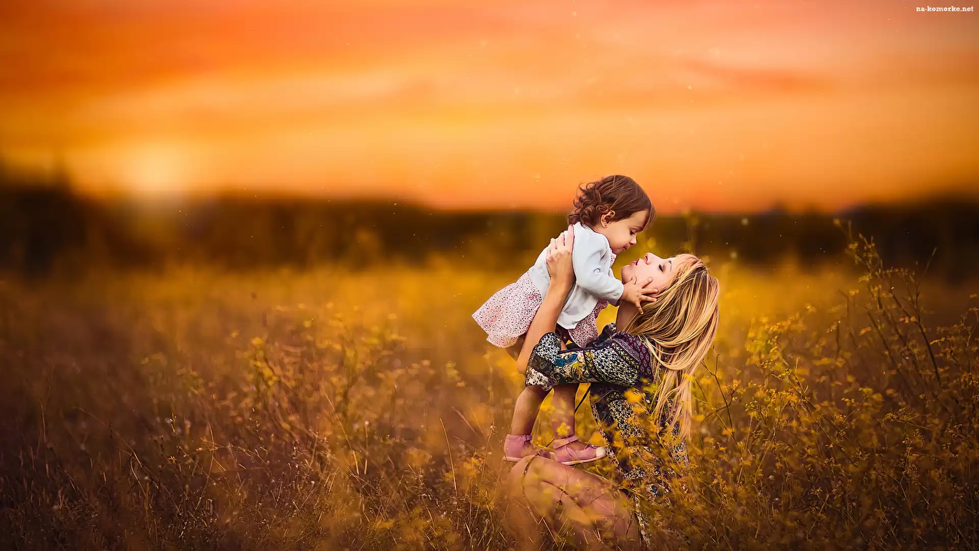 Łąka, Córka, Zachód słońca, Kwiaty, Kobieta, Matka, Dziecko na Komórkę
