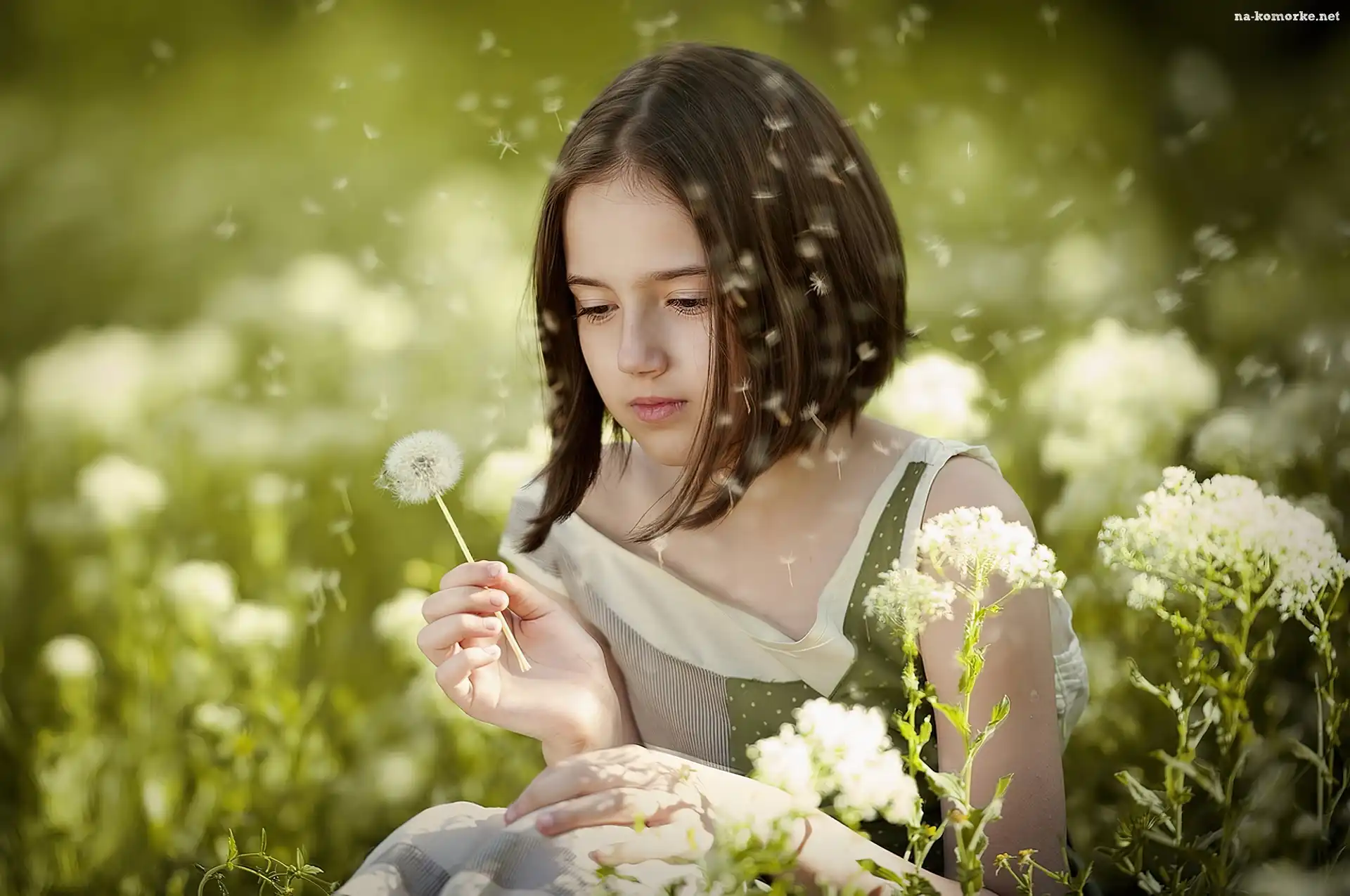 Dziewczyna, Dmuchawce, Łąka, Kwiaty na Komórkę