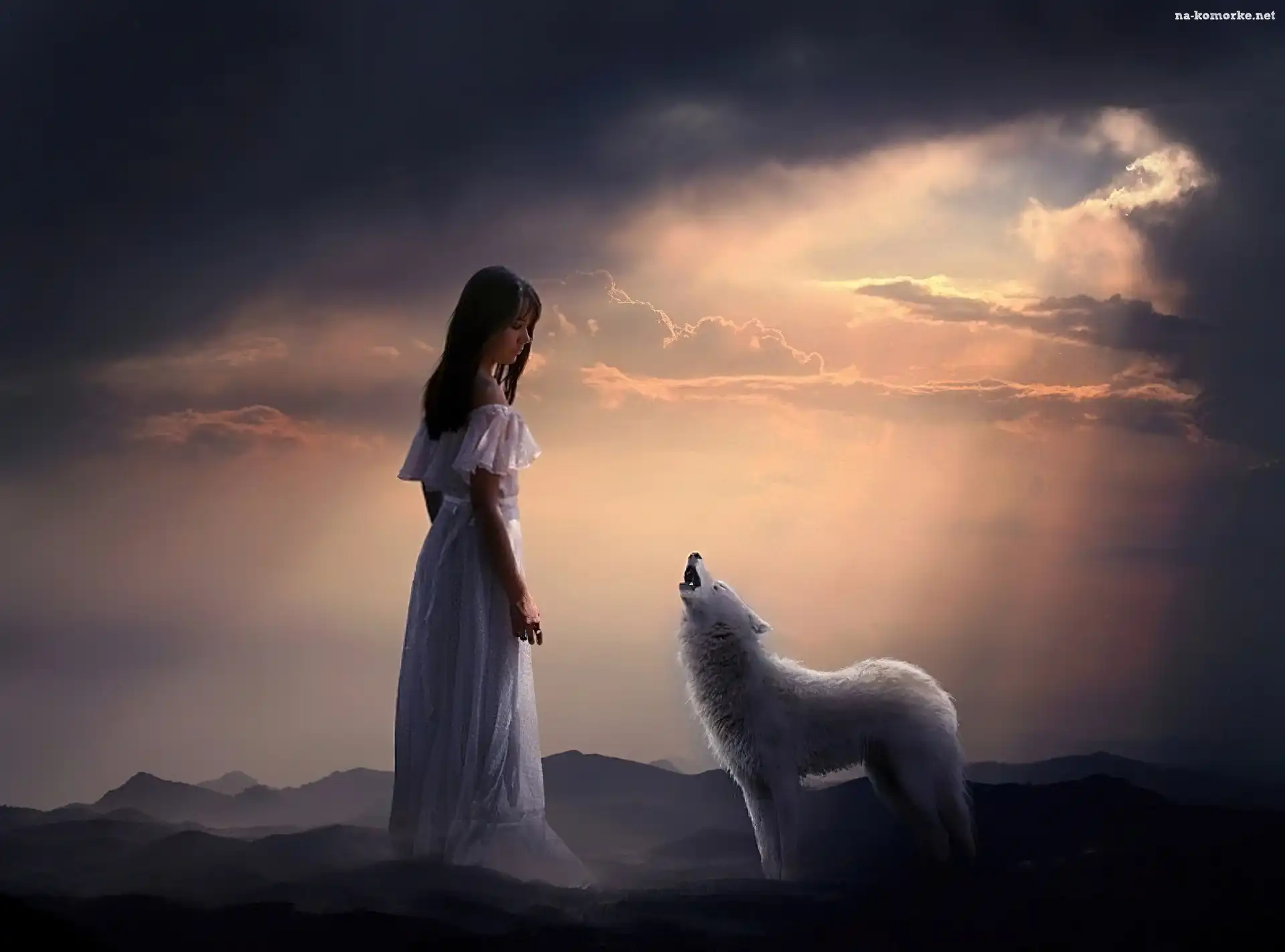 Dziewczyna, Chmury, Biały, Wilk na Komórkę